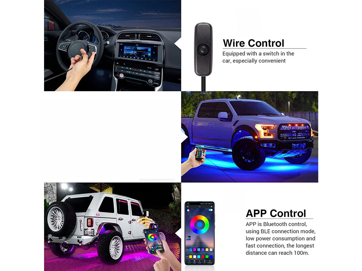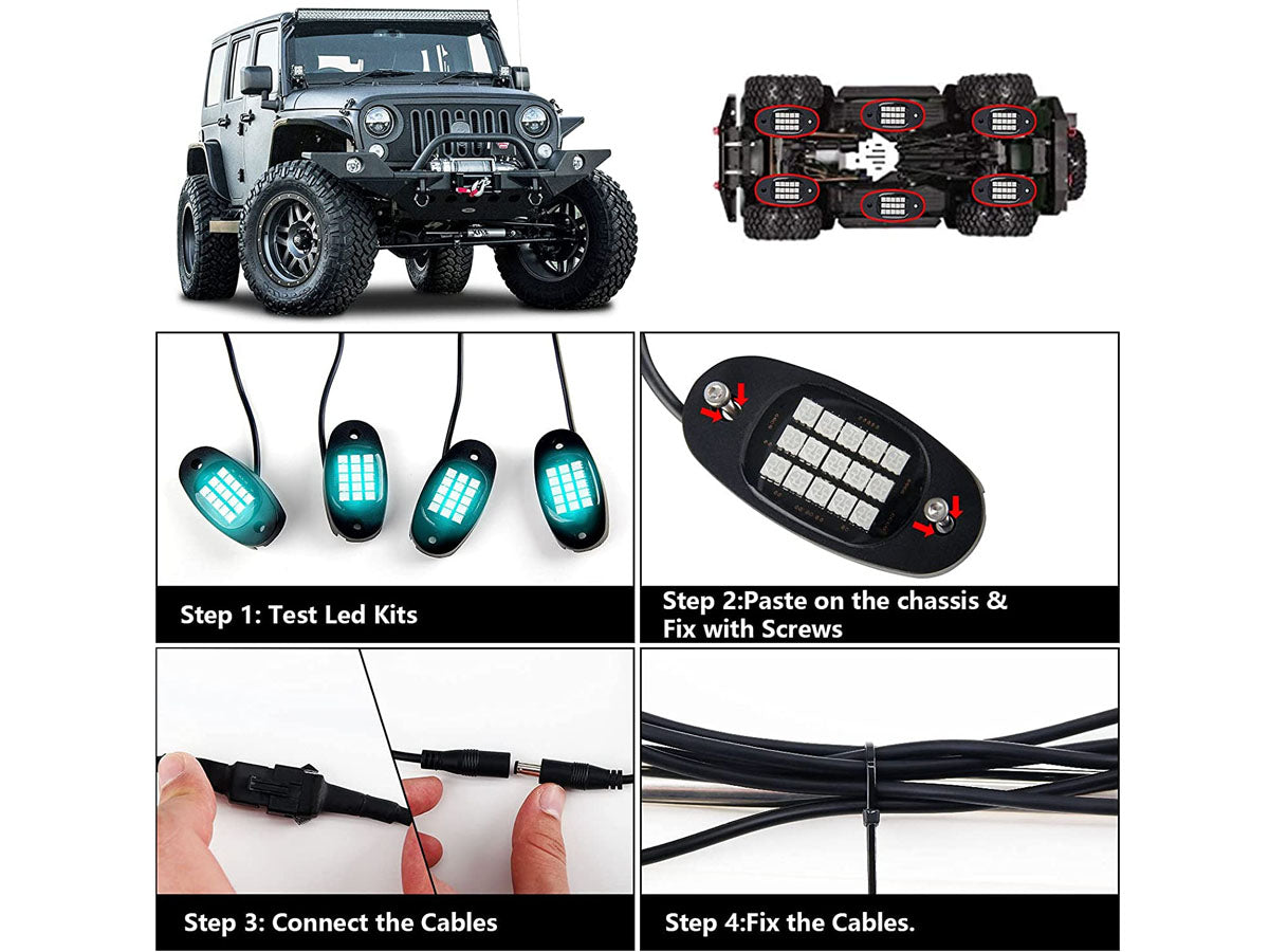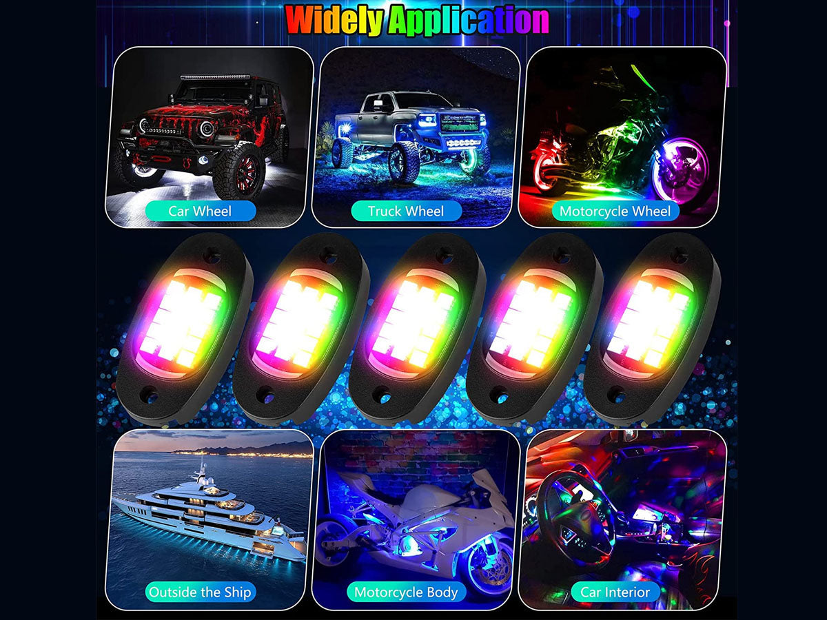 Rock lights kits can be widely used in cars, off-road, trucks, ATVs, UTVs, SUVs, ATVs motorcycles, boats, and so on, also used for interior, dome, neon lights, yacht lights, etc.