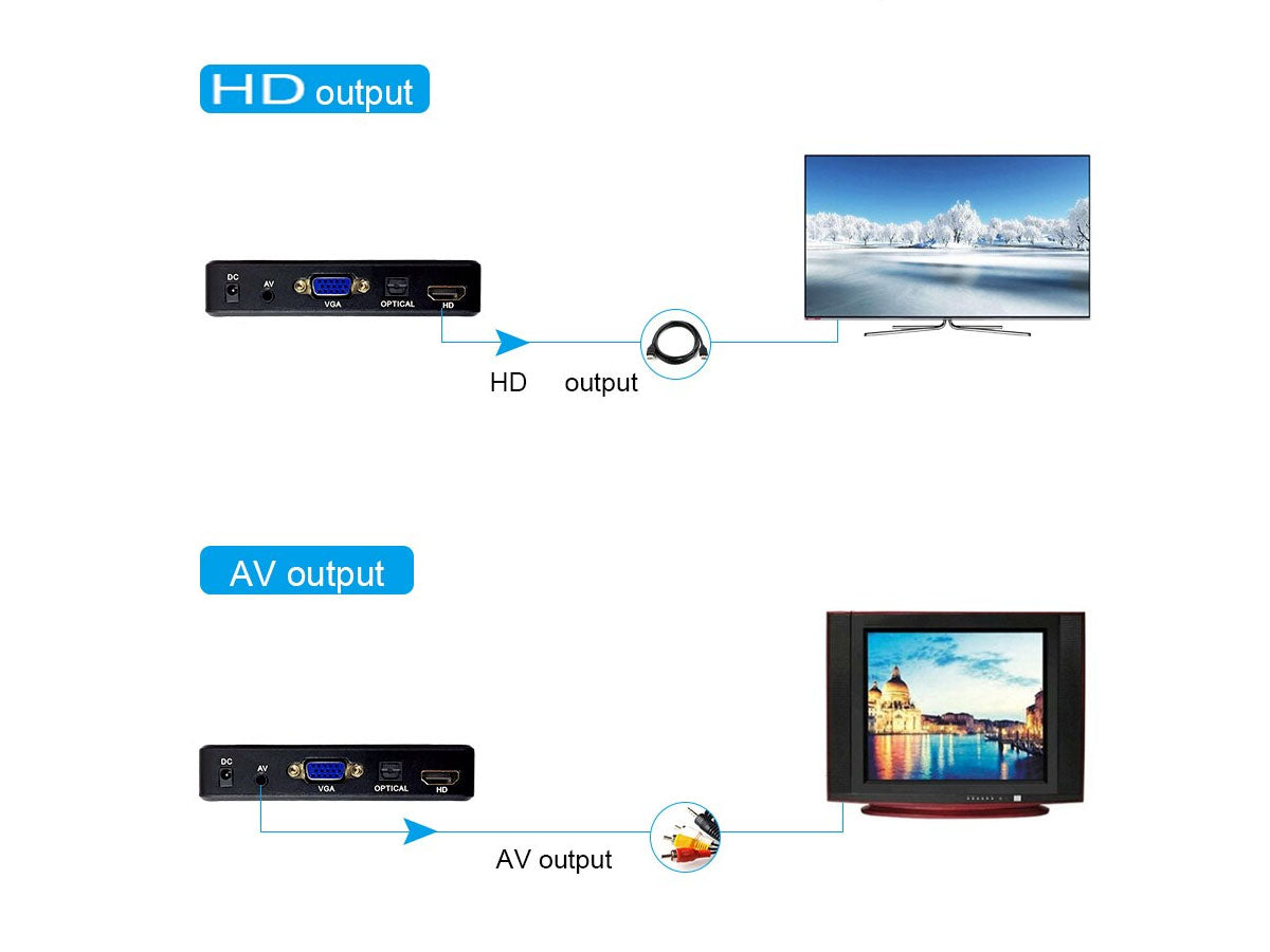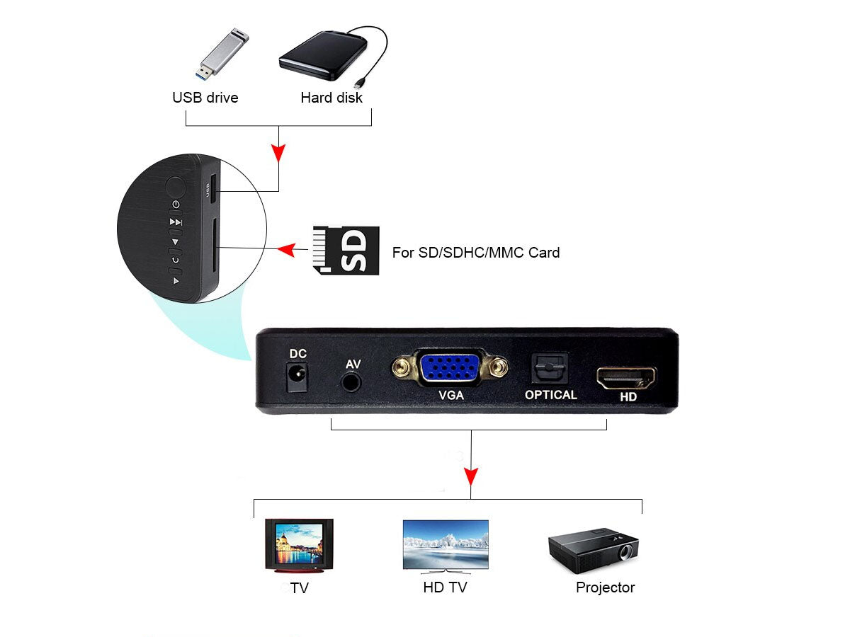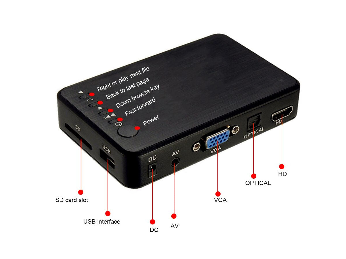 This HDMI Media Player has VGA and AV interfaces for video output. 1080p HDMI output for sending sharp and clear video and audio in pure digital format to HDTVs, as well as composite AV output for use with analog TVs. You can drive external USB storage devices such as USB HDD or USB pen drive, and play or manage files on them.