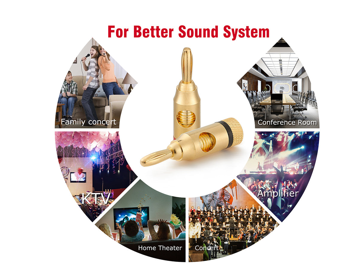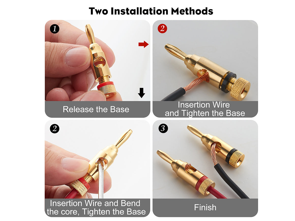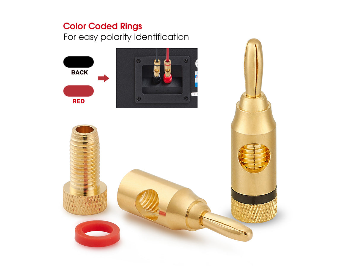 The body is made of copper with 24K gold plated, much more sturdy, and endurable, and helps resist corrosion to ensure stable connections. It also looks neat and tidy. These plugs are compatible with 8-20 AWG speaker wires, stackable for bi-wiring or running multiple sets of speaker