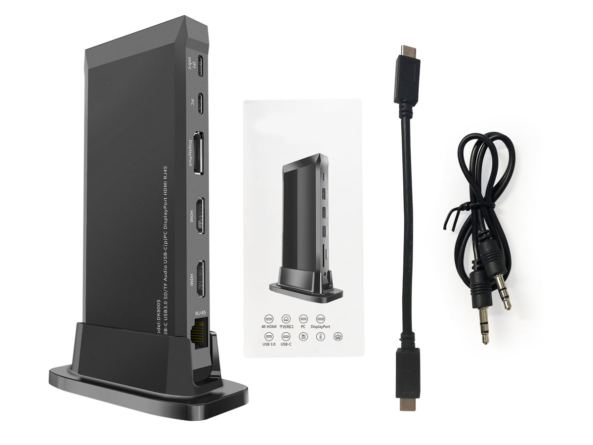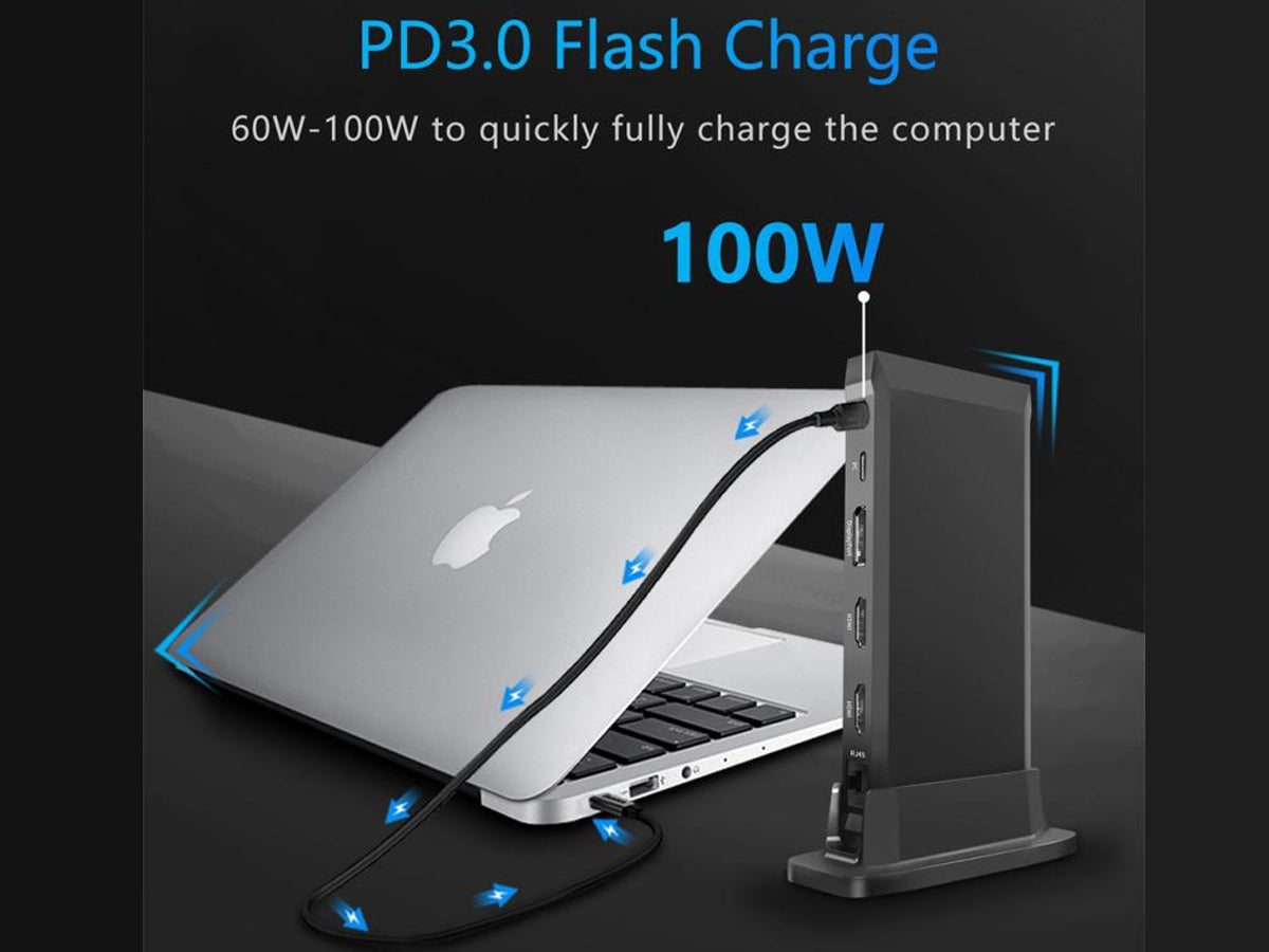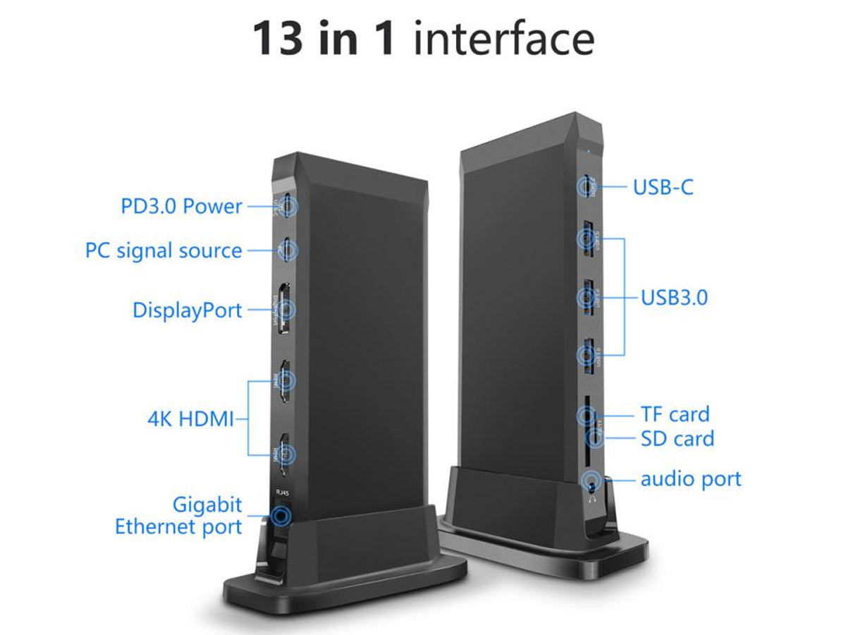 This 13-in-1 USB C Hub Docking Station comes with all the necessary functions you need in daily life and general work, Including 3 x USB 3.0 @ 5Gbps, 1 x USB C port, 2 x HDMI 4K@30Hz, 1 x Display port, 1 x USB-C: PD @ 100W, 1 x Rj45 ethernet, 1 x PC signal source port, 1 x SD, 1 x TF card, and 1 x 3.5mm Audio slot.