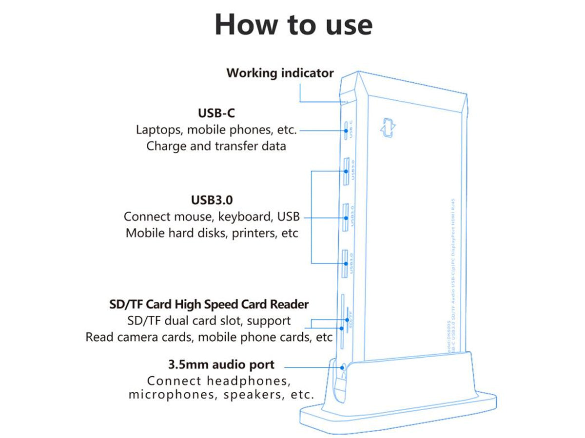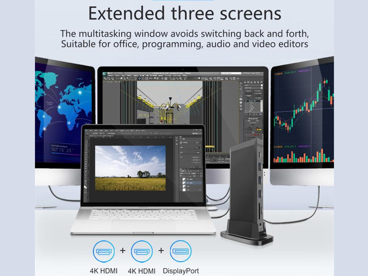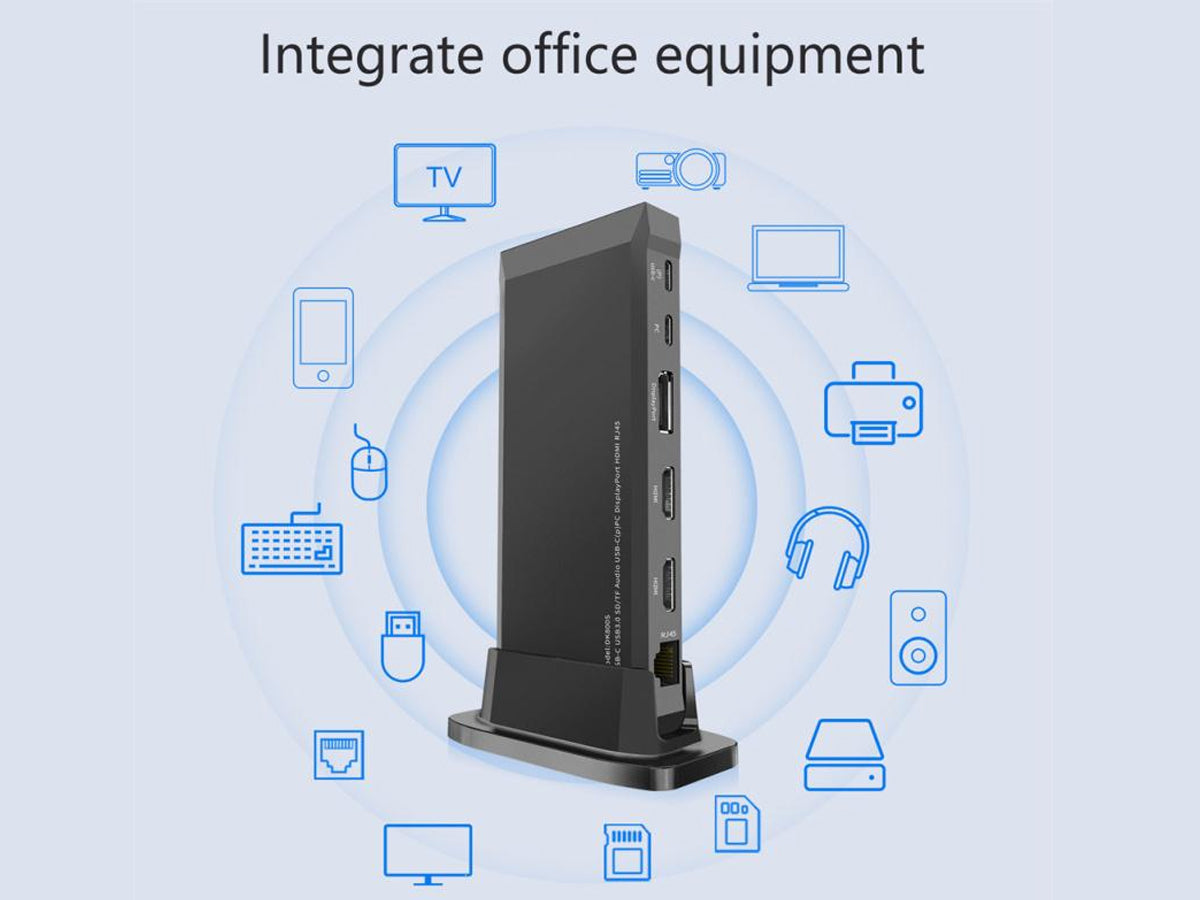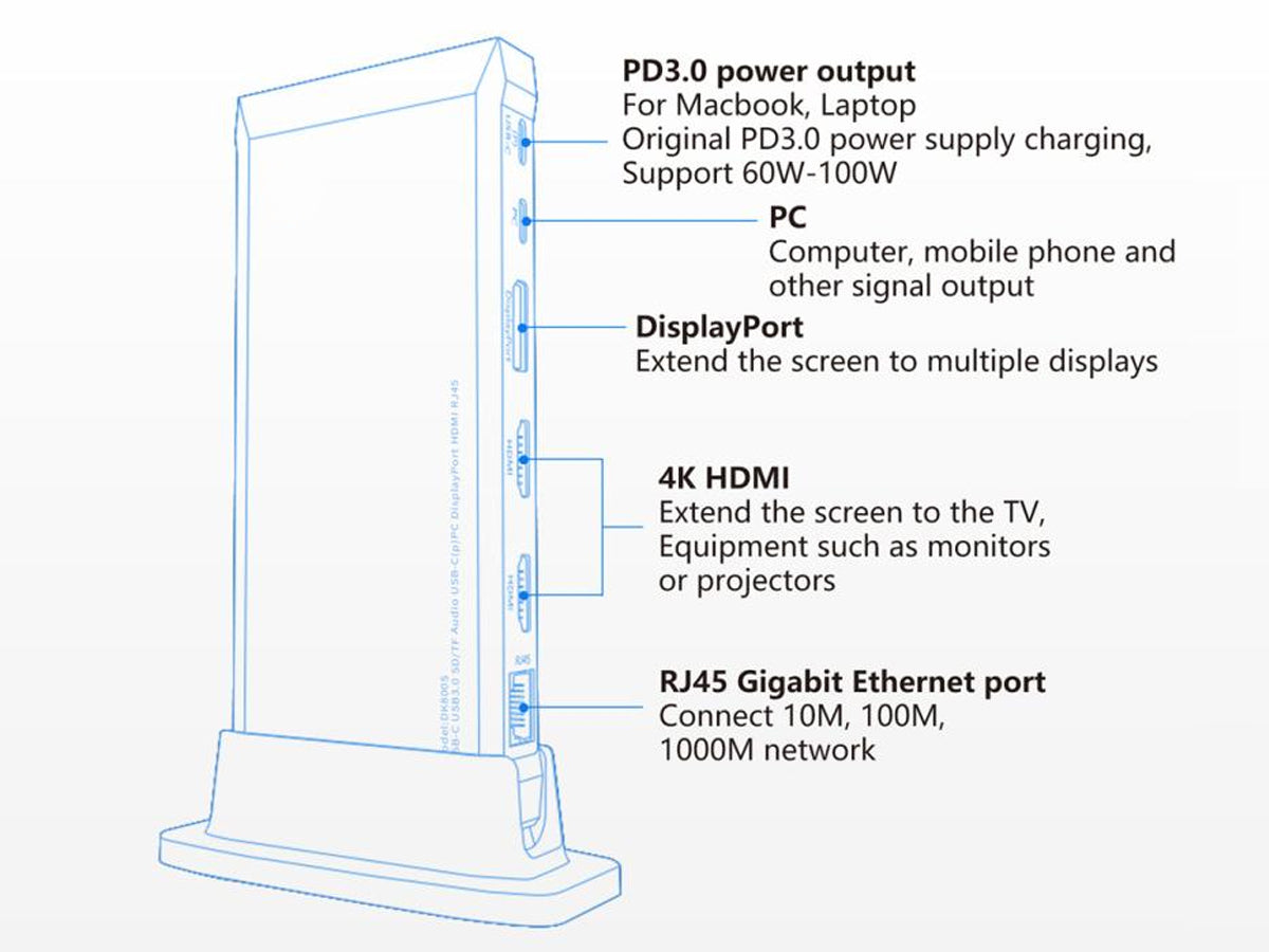 This 13-in-1 USB C Hub Docking Station comes with all the necessary functions you need in daily life and general work, Including 3 x USB 3.0 @ 5Gbps, 1 x USB C port, 2 x HDMI 4K@30Hz, 1 x Display port, 1 x USB-C: PD @ 100W, 1 x Rj45 ethernet, 1 x PC signal source port, 1 x SD, 1 x TF card, and 1 x 3.5mm Audio slot.