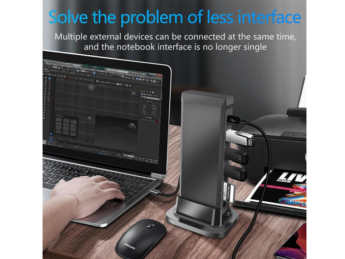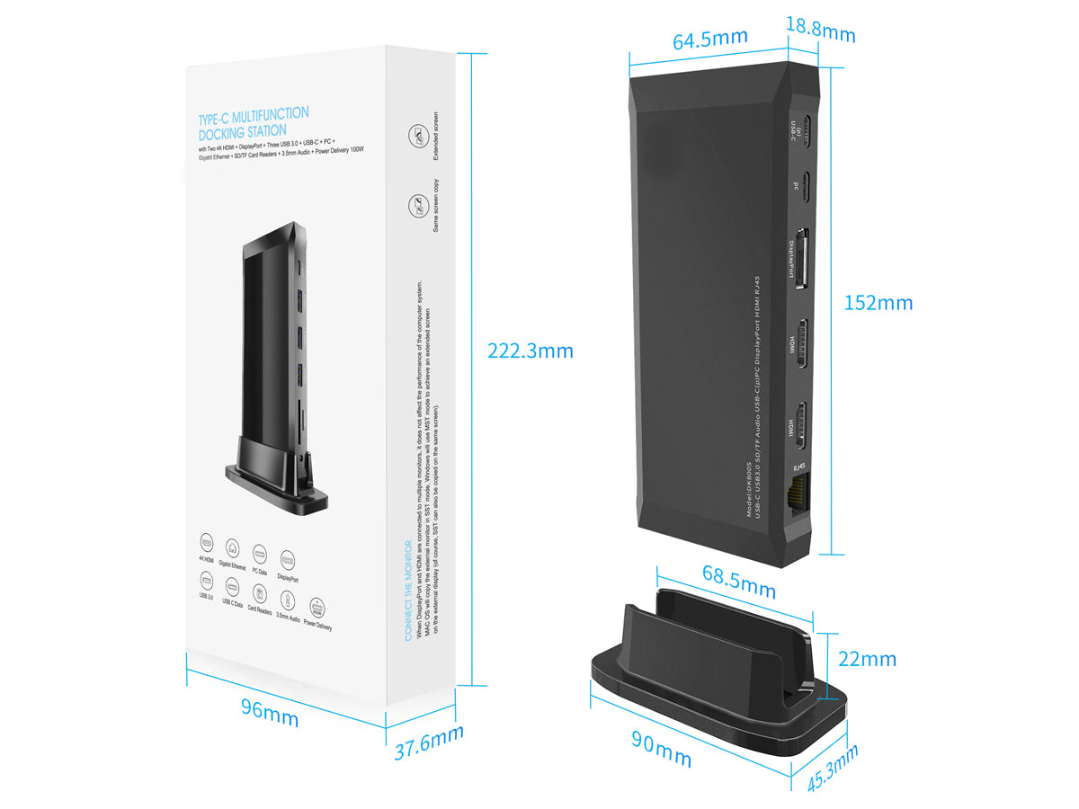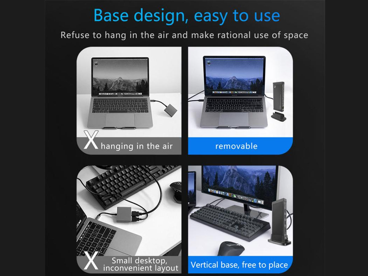 This USB type C hub with RJ45 Gigabit Ethernet LAN port allows you to directly enjoy ultra-fast Gigabit Ethernet speeds and wired connection reliability. The integrated display port ensures an extended monitor view on both Windows and Apple computers. You will save space on your desk by the vertical placement of the Docking Station.
