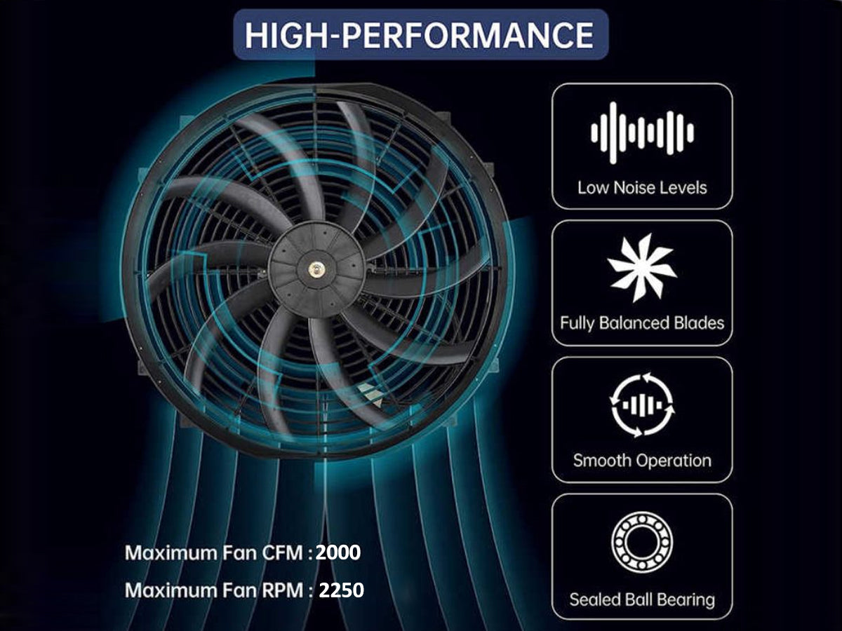 The electric slim Radiator Fan is lightweight, has an ultra-slim design so the fan can be installed flush against your radiator, or other applications. This 14" Radiator Fan comes with a universal fan mounting kit which makes it easy to install. The Radiator fan can be used in a wide variety of other applications as well, including A/C condenser cooling, mounting on an intercooler to prevent heat soak during drag racing events, or cooling the radiator in a water-to-air intercooler setup.