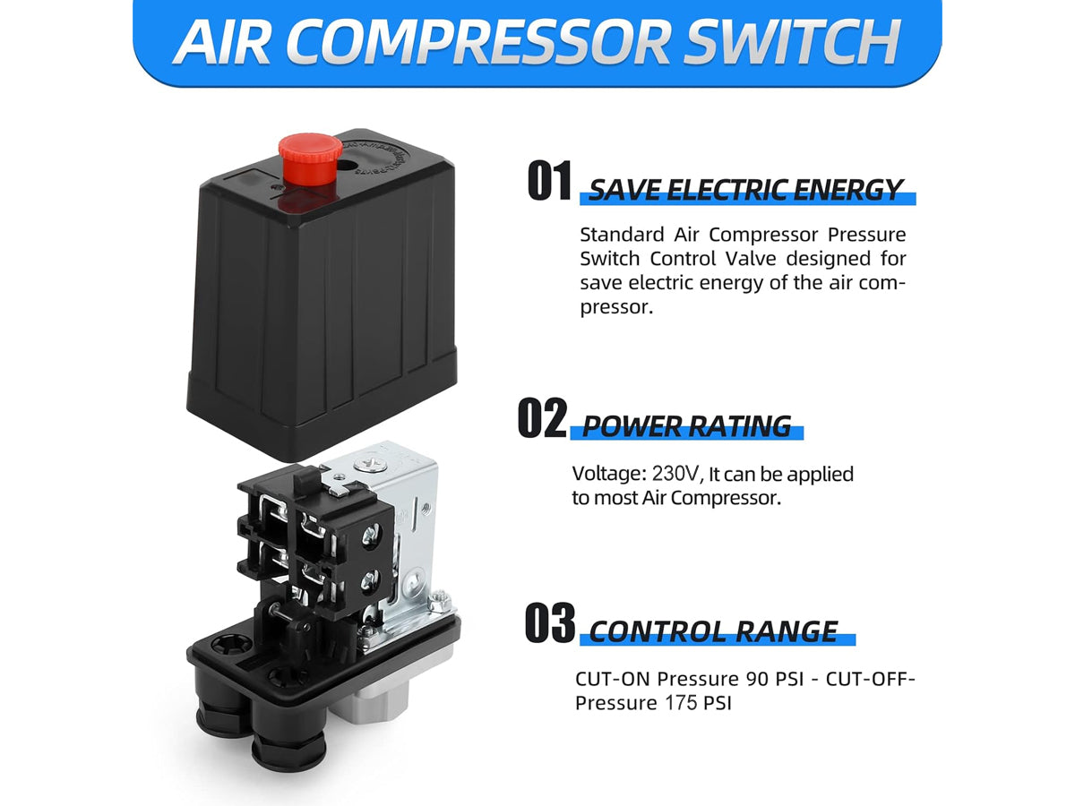 Elevate your air compressor's performance with this robust 175PSI Pressure Switch for Air Compressor. Pressure Switch for Air Compressor engineered for precision and efficiency, it is designed to regulate air pressure with high accuracy, helping you conserve energy and ensure optimal operation. Its durable construction and user-friendly design make it a must-have for any air compressor setup.