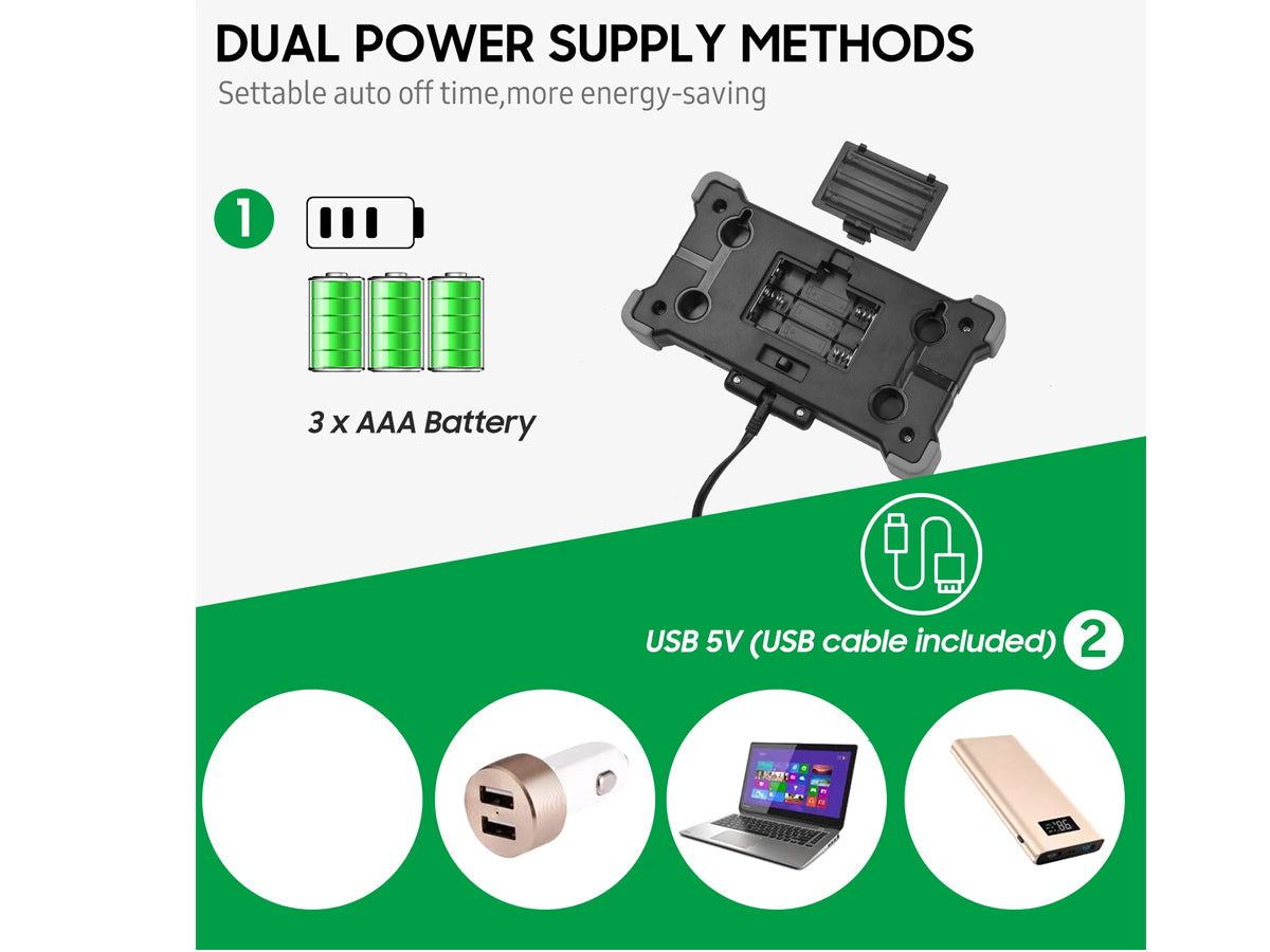- Operates using either 3 X AAA batteries or a 5V USB connection