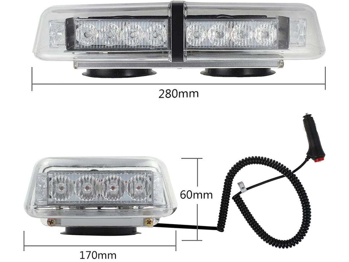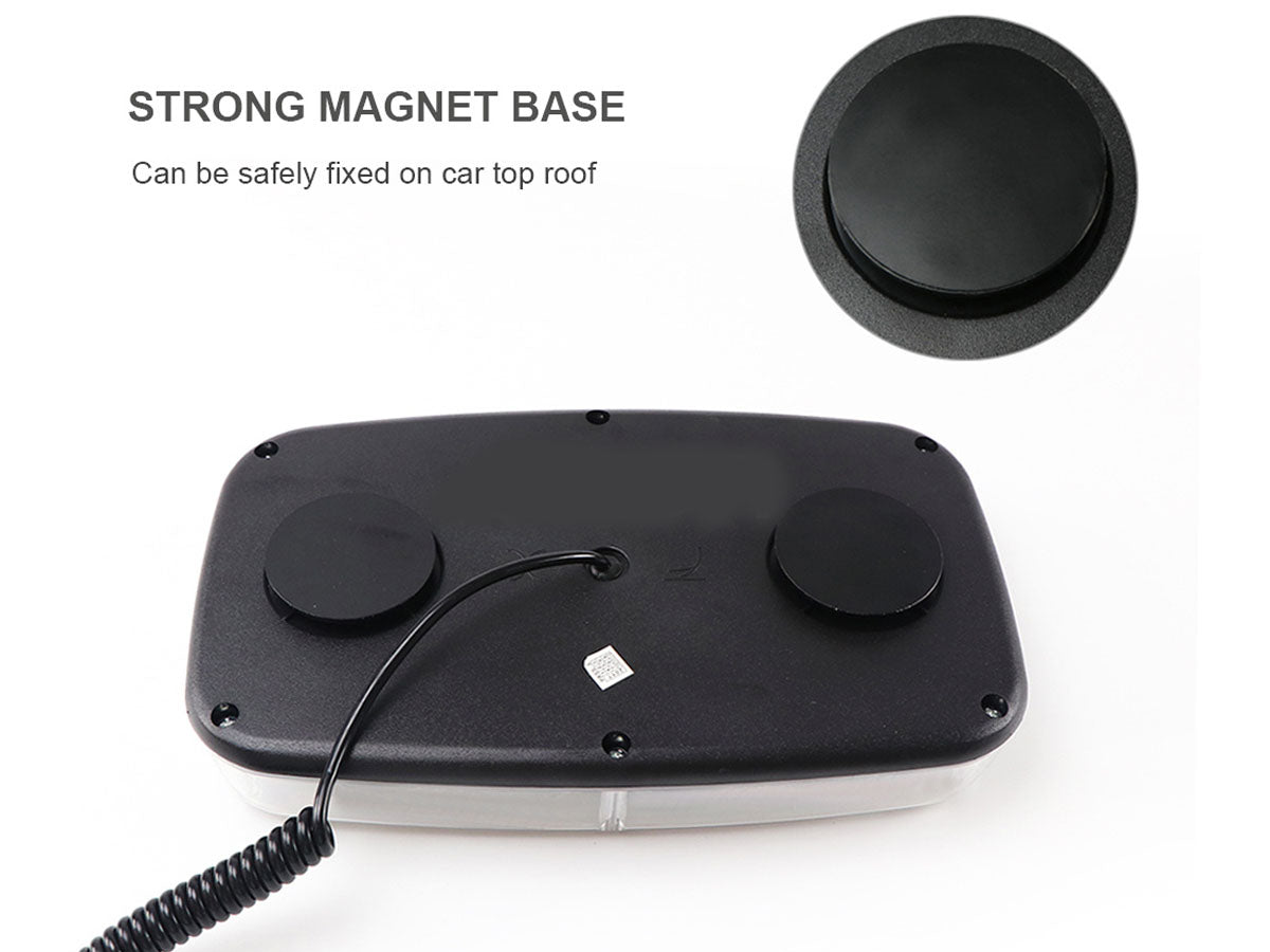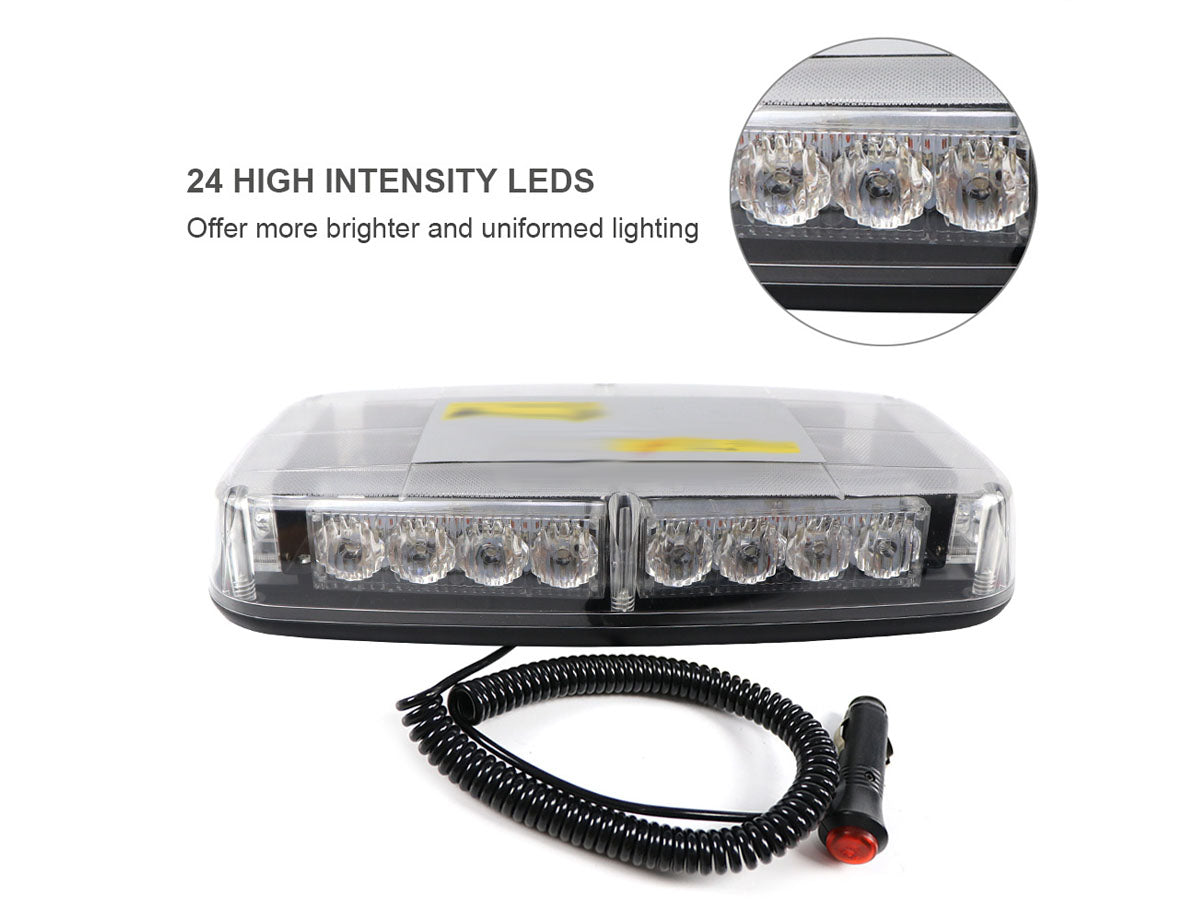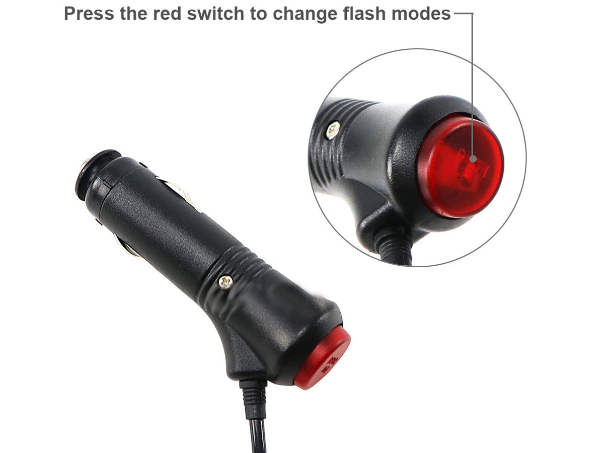 The Waterproof LED Flashing Strobe Light features 24 bright LED lights with 7 flash modes, a built-in IP65 waterproof design, and is suitable for all vehicles with a 12/24 volt DC cigarette adapter. The light is durable, with 2 magnetic pods with protective rubber feet that can withstand high speeds and can be safely fixed to a car rooftop.