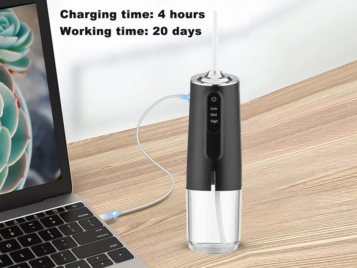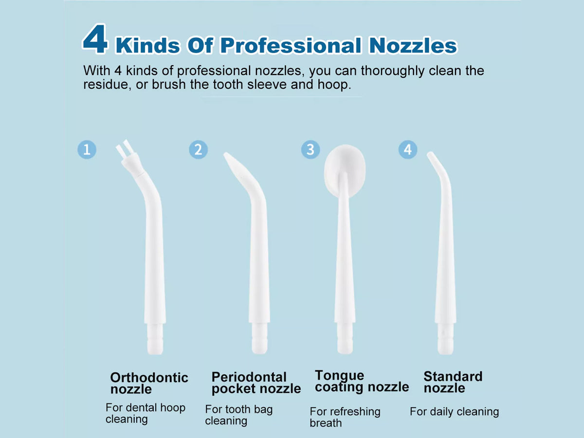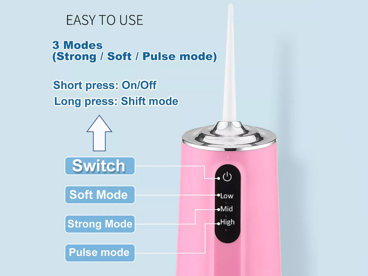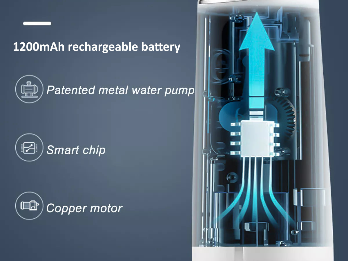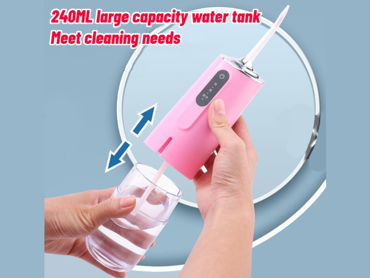 This Waterpulse water flosser with a built-in smart chip that accurately controls the size of water flow. This rechargeable Water Flosser comes with an extra-large 240ml water tank with a leak-proof design that provides continuous flossing for an entire heavy-duty session.