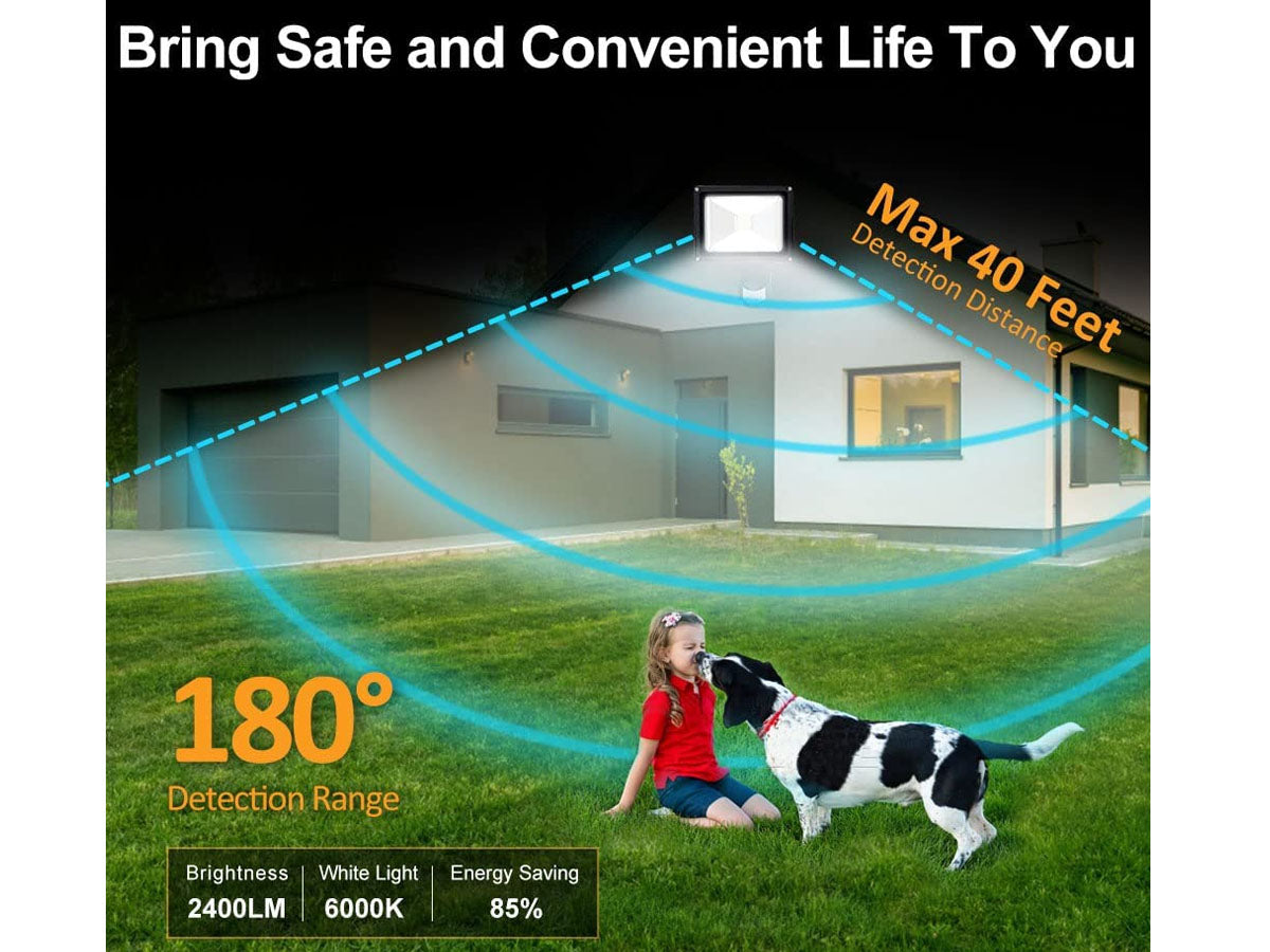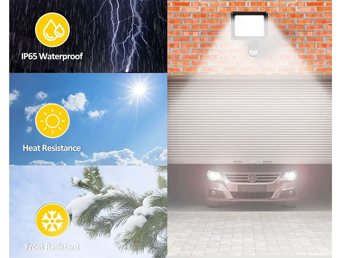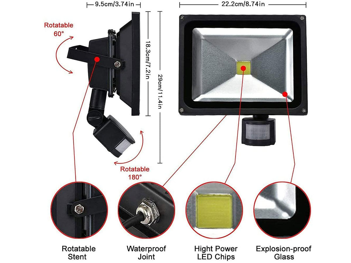 The shell of LED Flood Light is made of high-quality die-cast aluminium, which has good heat dissipation, prolonging the service life. This security flood light with motion sensor has more than 50000 hours lifespan, Saving labour costs to replace bulbs with a short lifespan.