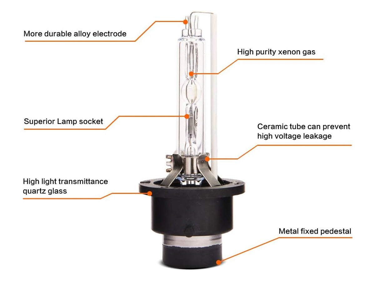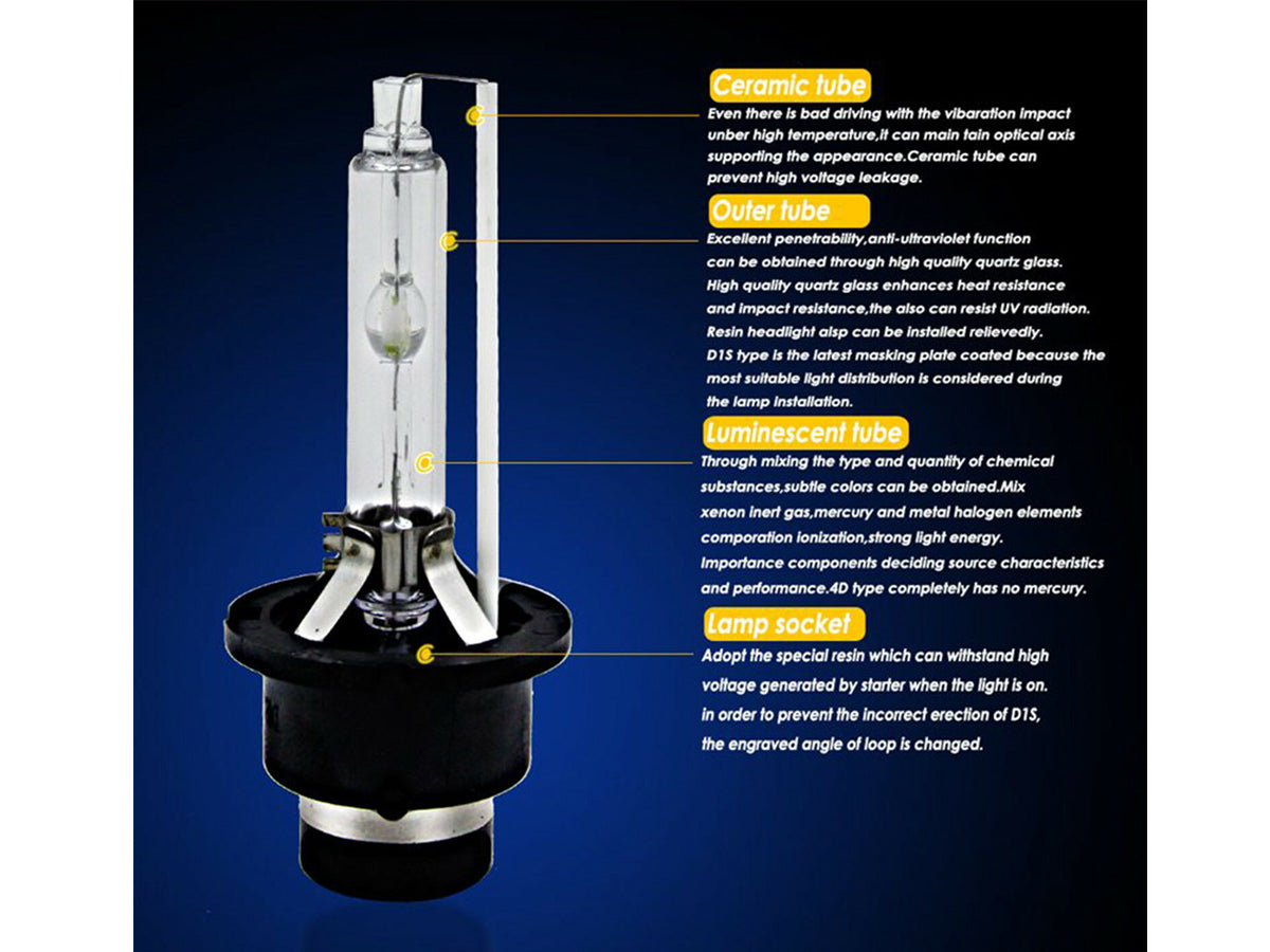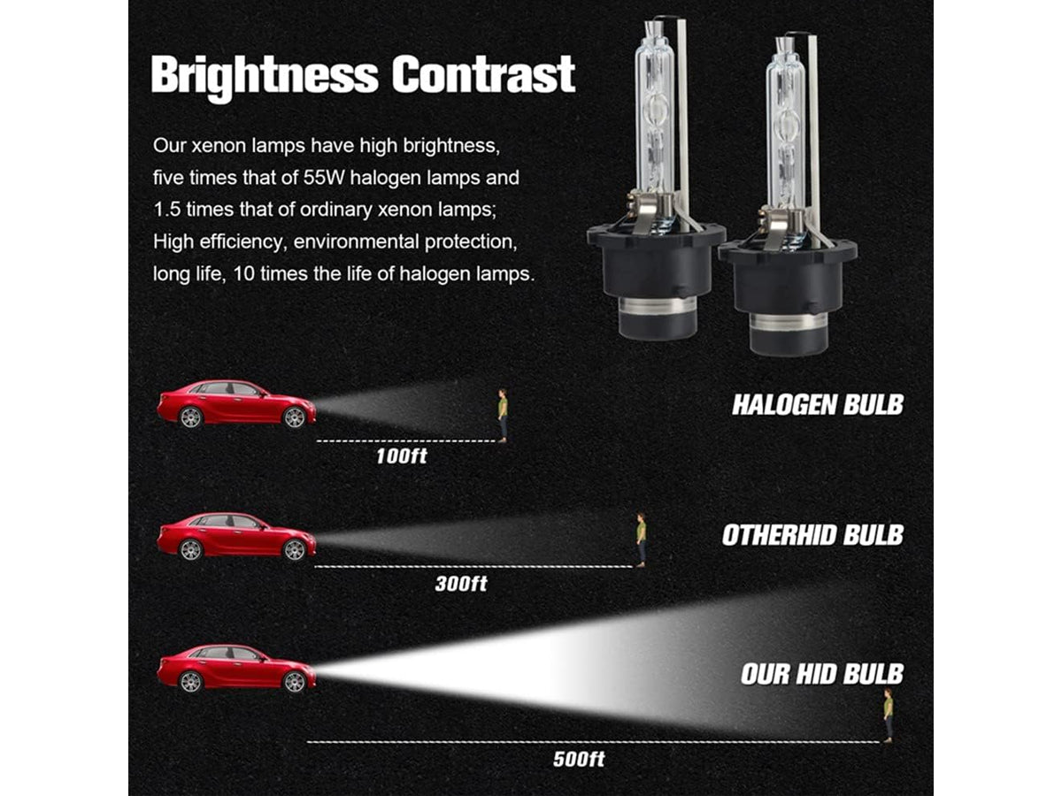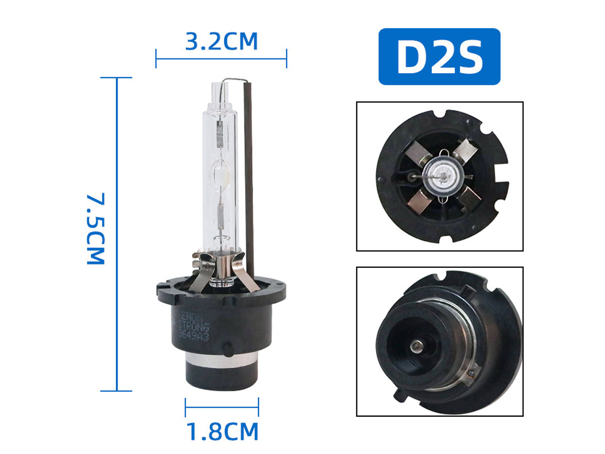 This upgraded D2S HID Xenon Bulb Headlight is energy efficient but more pleasant to provide clear light. This Pair of HID Xenon Bulb will bring you comfort and safe driving at night. This Pair of 35W D2S HID Xenon Bulb Headlights will provide you with a winning combination of brighter light output with lower power consumption