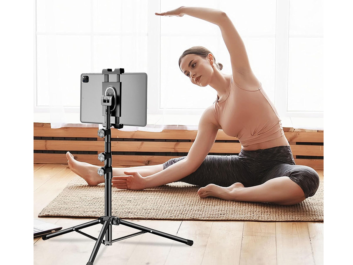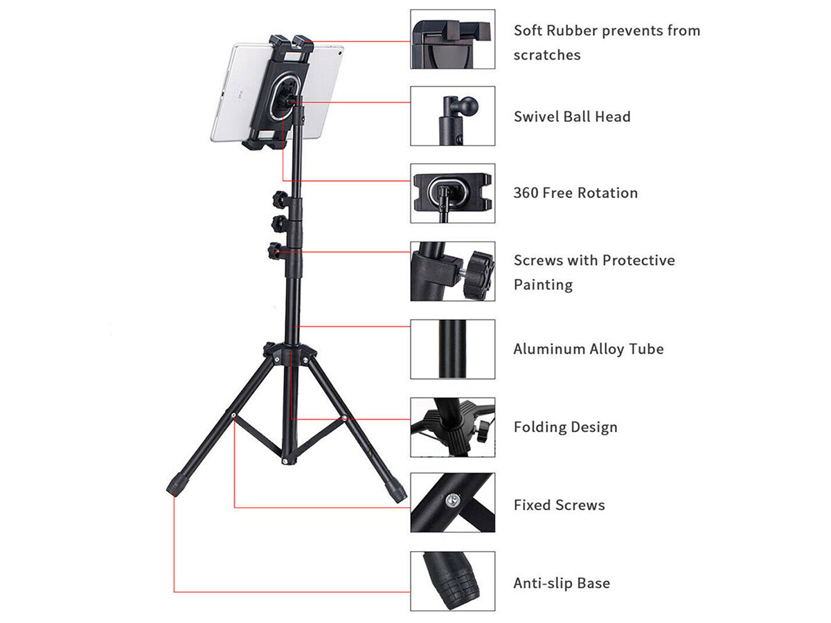This Tablet iPad Stand with Three Legs and a centre post to give maximum stability and there are even silicon pads inside the clipper to hold the device securely in place without slipping out and doesn't scratch or dent the device. This Tablet iPad Stand has an excellent adjustable height range from 50 cm to 1.35 m so that you can adjust to a good working height, Also the 360-degree rotation ball joint allows you to adjust the tablet at any angle and position. Easily change the orientation of the tablet from portrait to landscape, almost any angle in between with the handy tilt motion