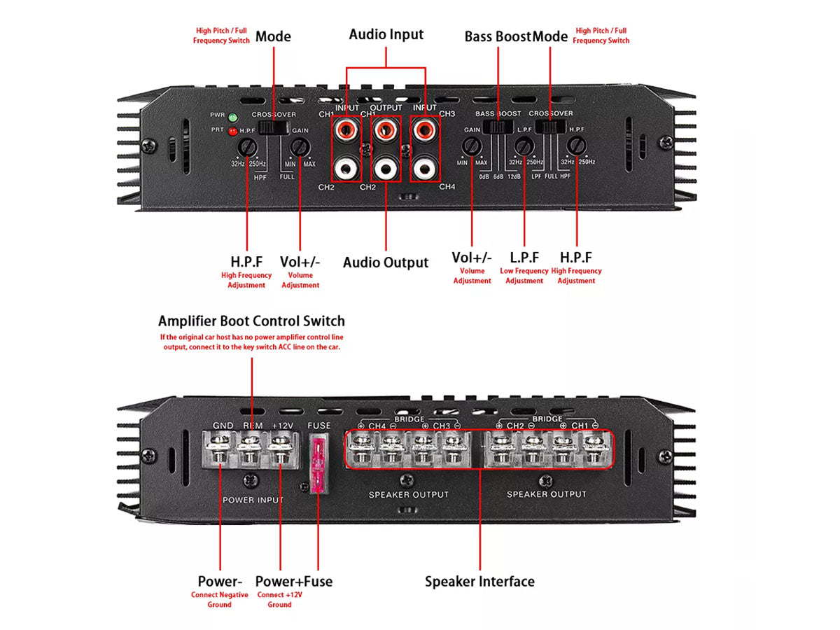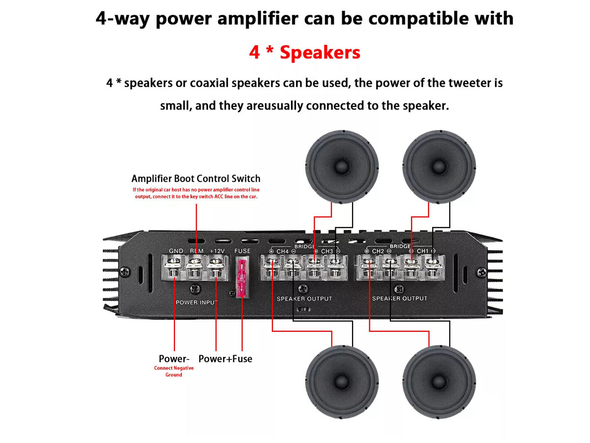 This 4 Channels Car Amplifier 12V will power your front and rear speakers. You'll hear much more of the little details in your music, especially when you turn your system up to overcome road noise.