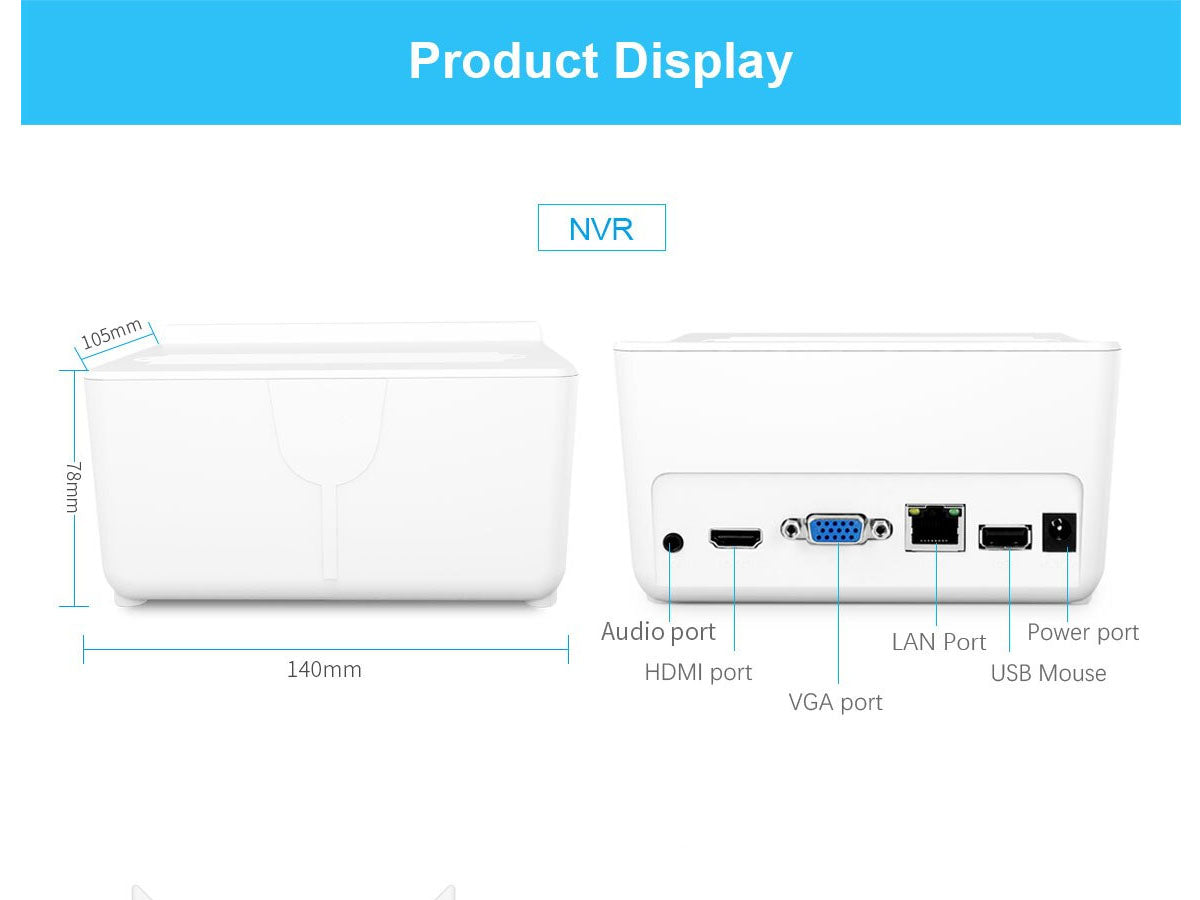 - NVR Interface: Audio, HDMI, LAN, Power, USB Mouse, VGA