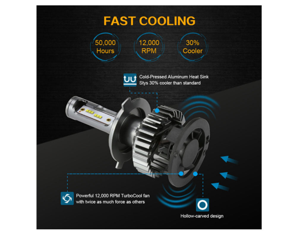 Fan Cooling: These H4 Headlight Bulbs are equipped with High-speed silent cooling fans, that provide strong cooling wind to help dissipate heat generated by LED chips, ensure that the bulb works steadily and continuously.