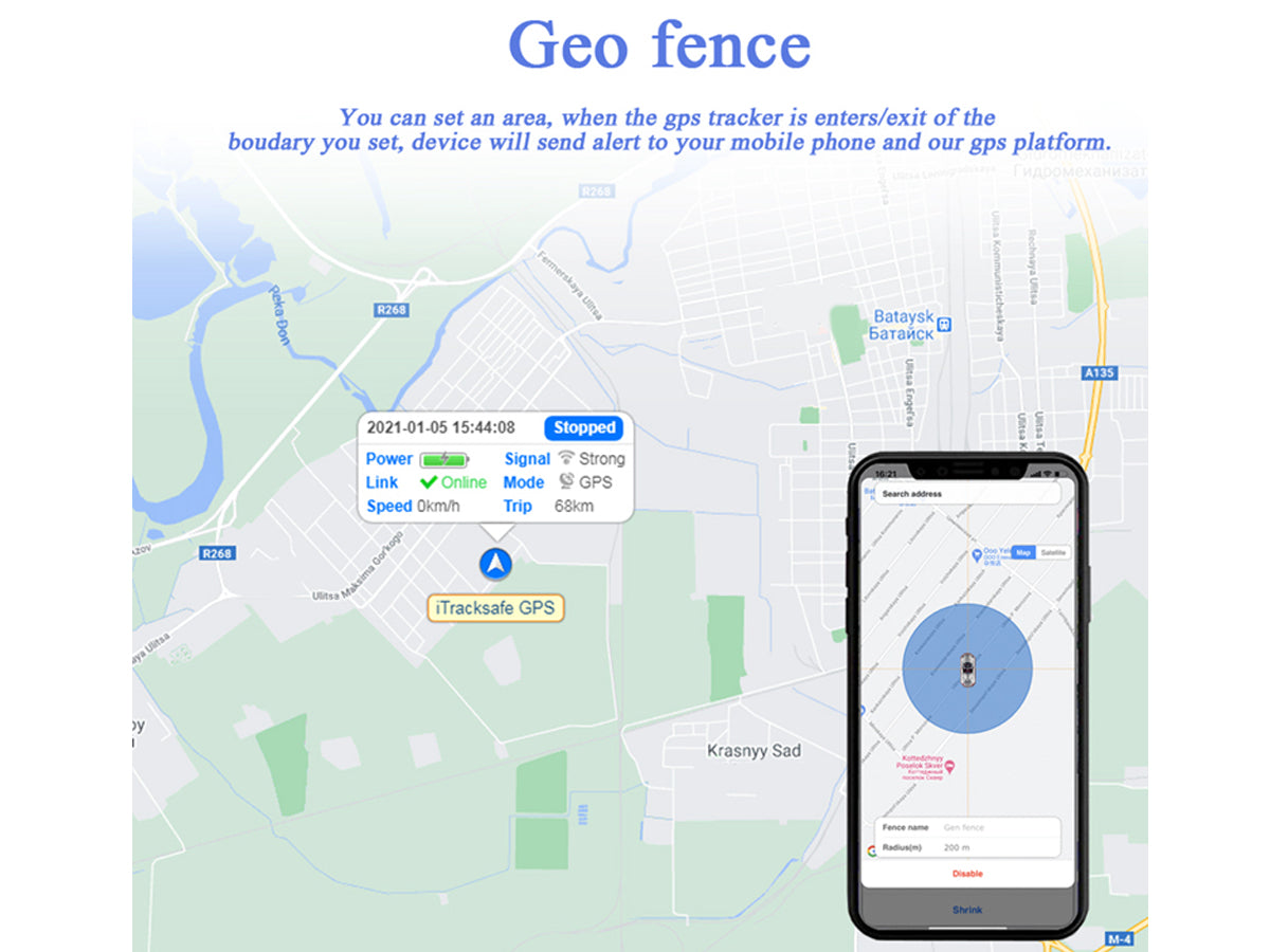 - Built-in Geo Fence, get instant alerts anytime the tracker enters or leaves the area