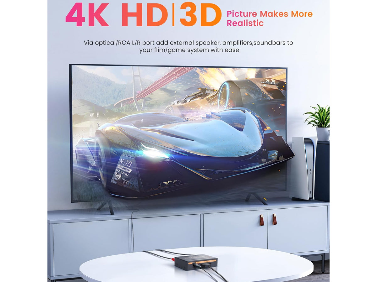 - Converts HDMI audio to optical or 2-channel analog outputs