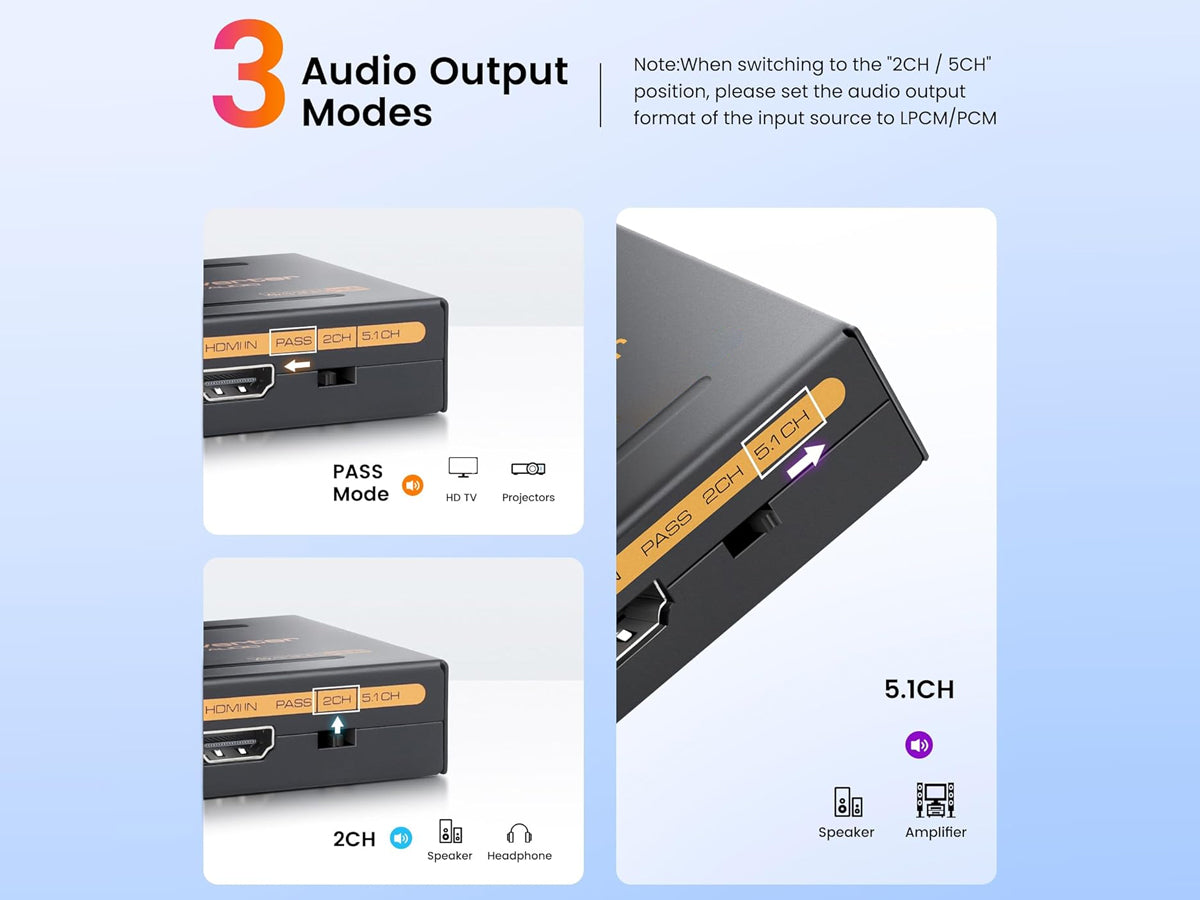 - Three audio modes: PASS, 2.0CH, 5.1CH for flexible sound options