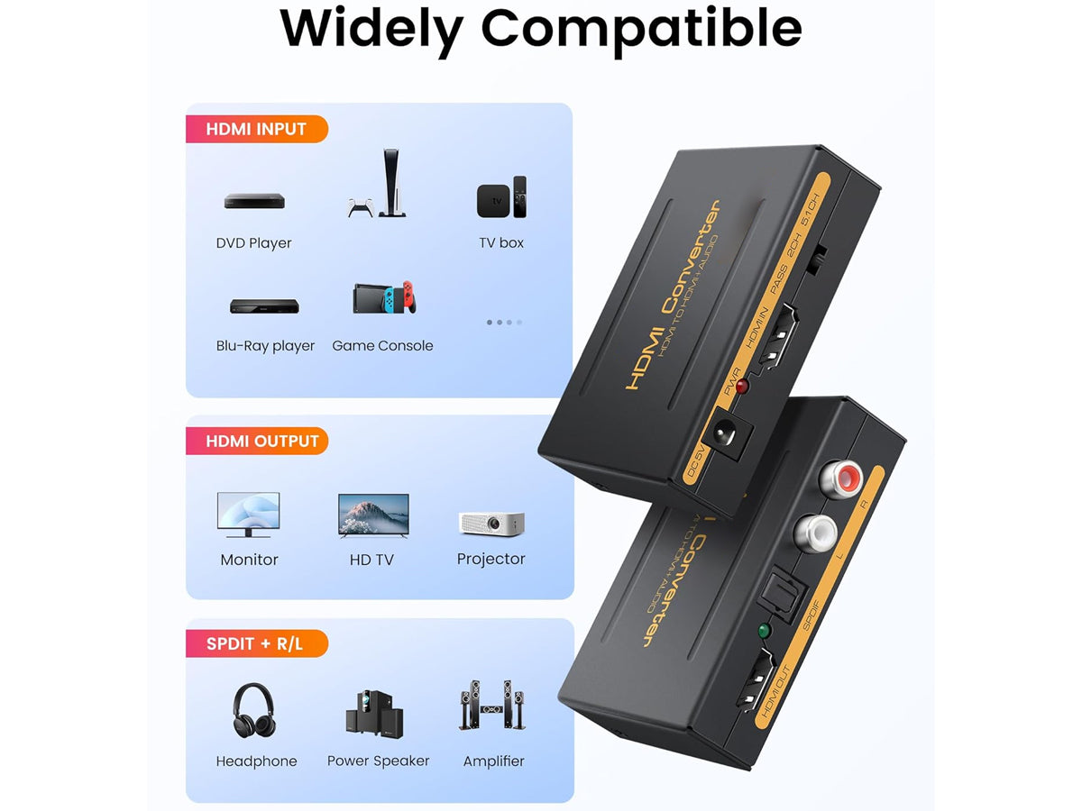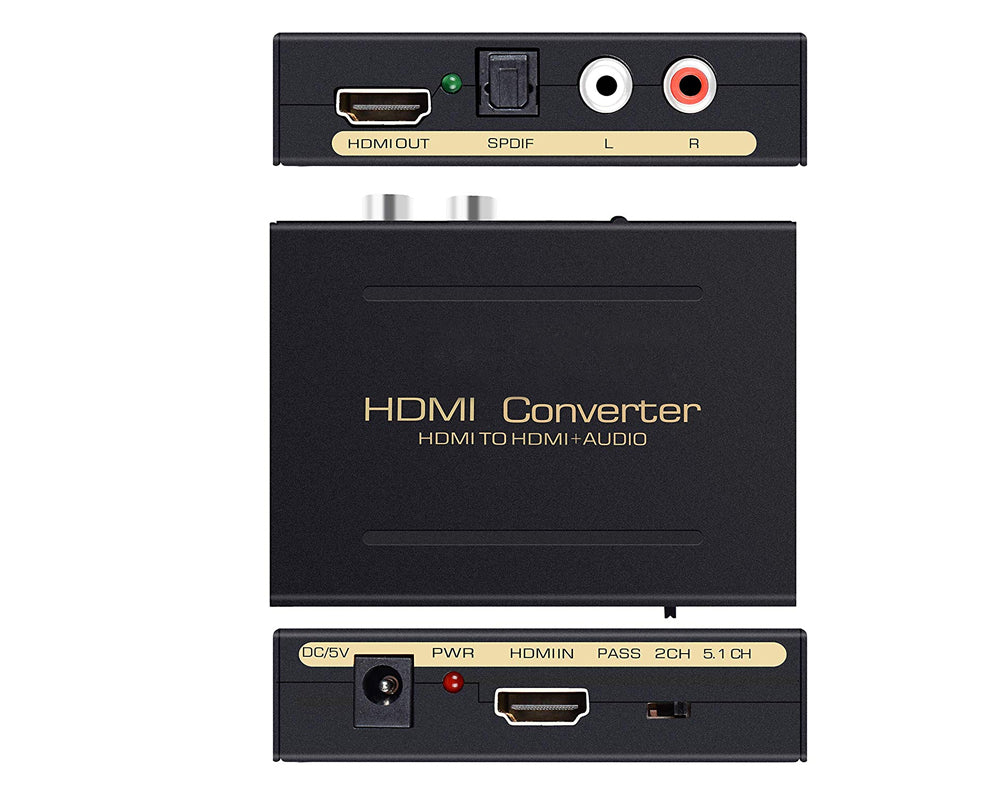 - HDMI to HDMI converter with SPDIF and RCA L/R audio extraction.