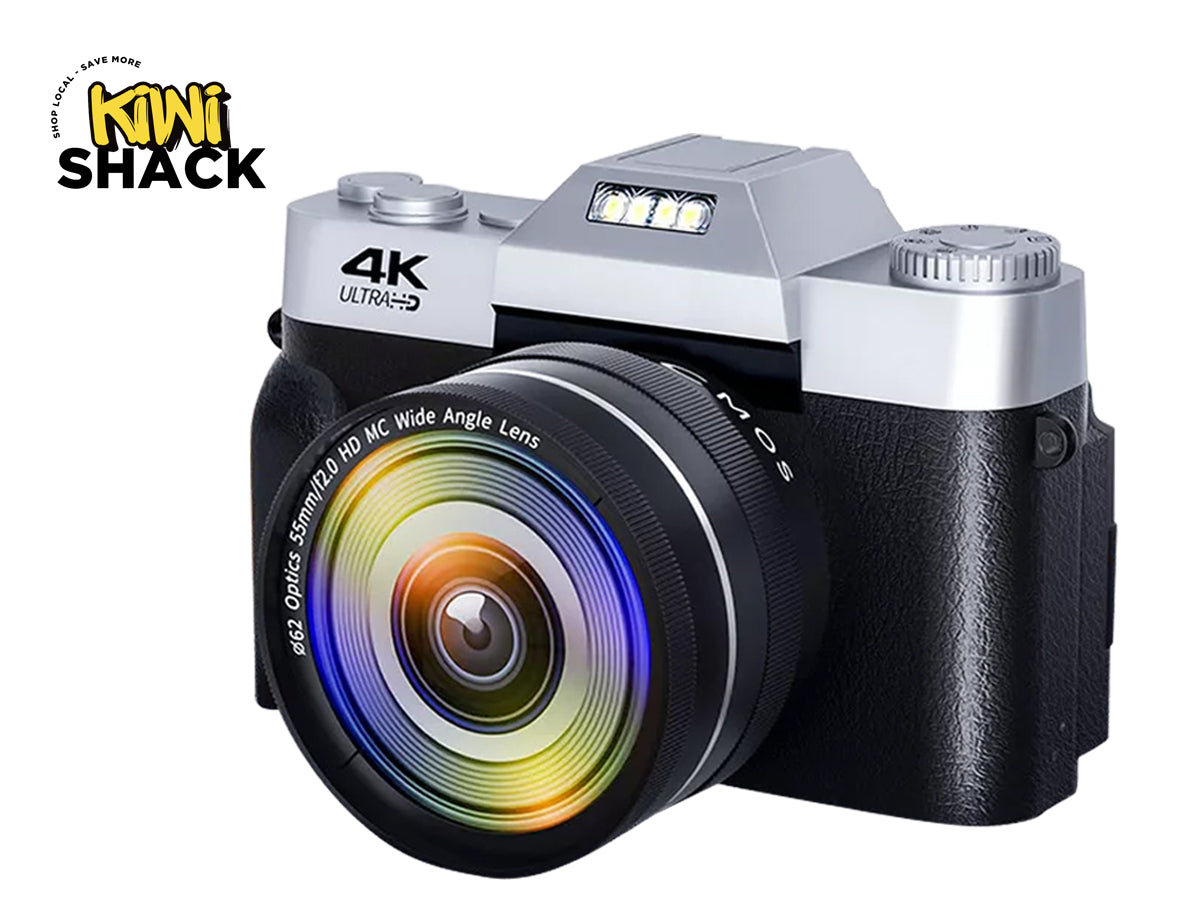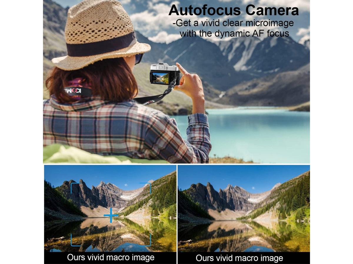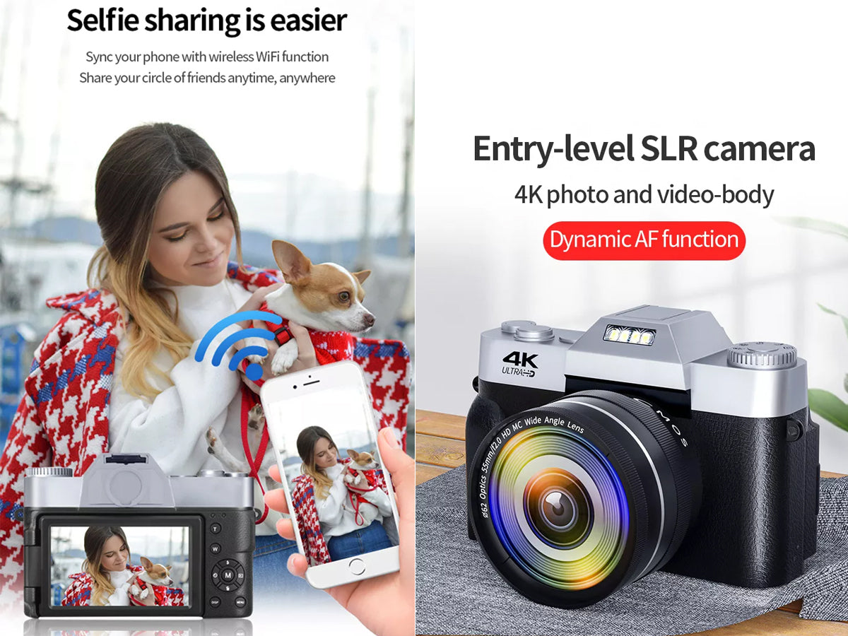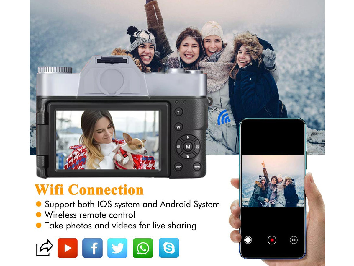 This WiFI Video Camera has a 3-inch full-frame view screen that can flip to 180-Degree so you can take selfies or videos of yourself. With built-In fill light, it can take pictures in low light. It also comes with a 52mm wide-angle lens.