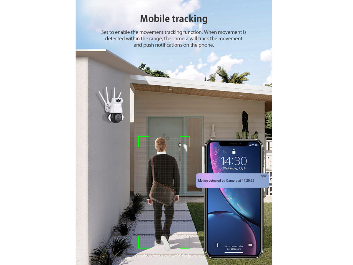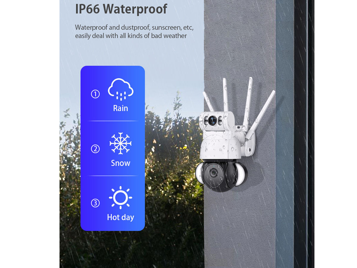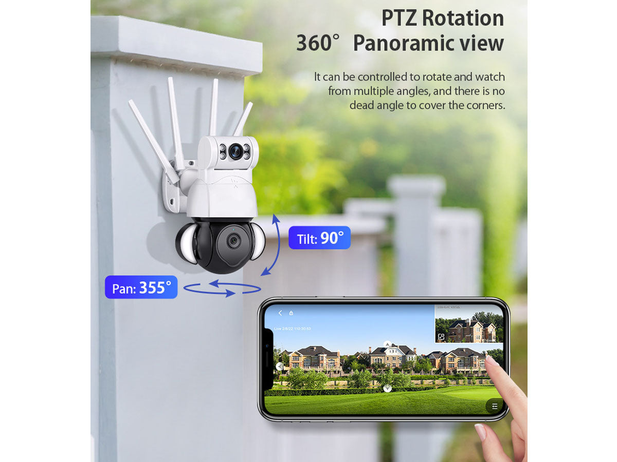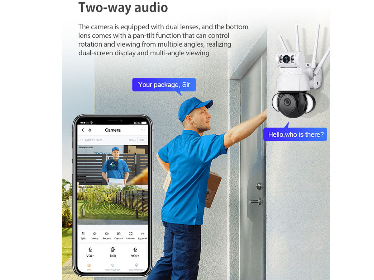 The 4MP WiFi Smart Security Camera has dual cameras and it can monitor your home in Ultra HD 4k resolution, offering you clear images and videos day and night. Protect your home around the clock. A dual-lens allows this wireless security WiFi Security Camera to show zoomed-in footage and zoomed-out footage with just a click.