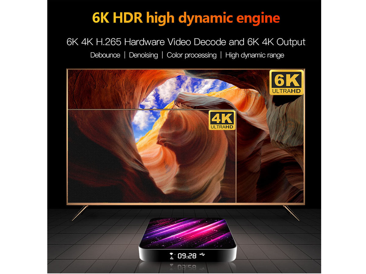 This 6K Android TV box is equipped with the latest Android, powered by Quad-Core Ultra high-Speed CPU, and H.265 image processing technology which makes sure the android box runs stable and smooth to load movies, pictures, and games without a buffer.