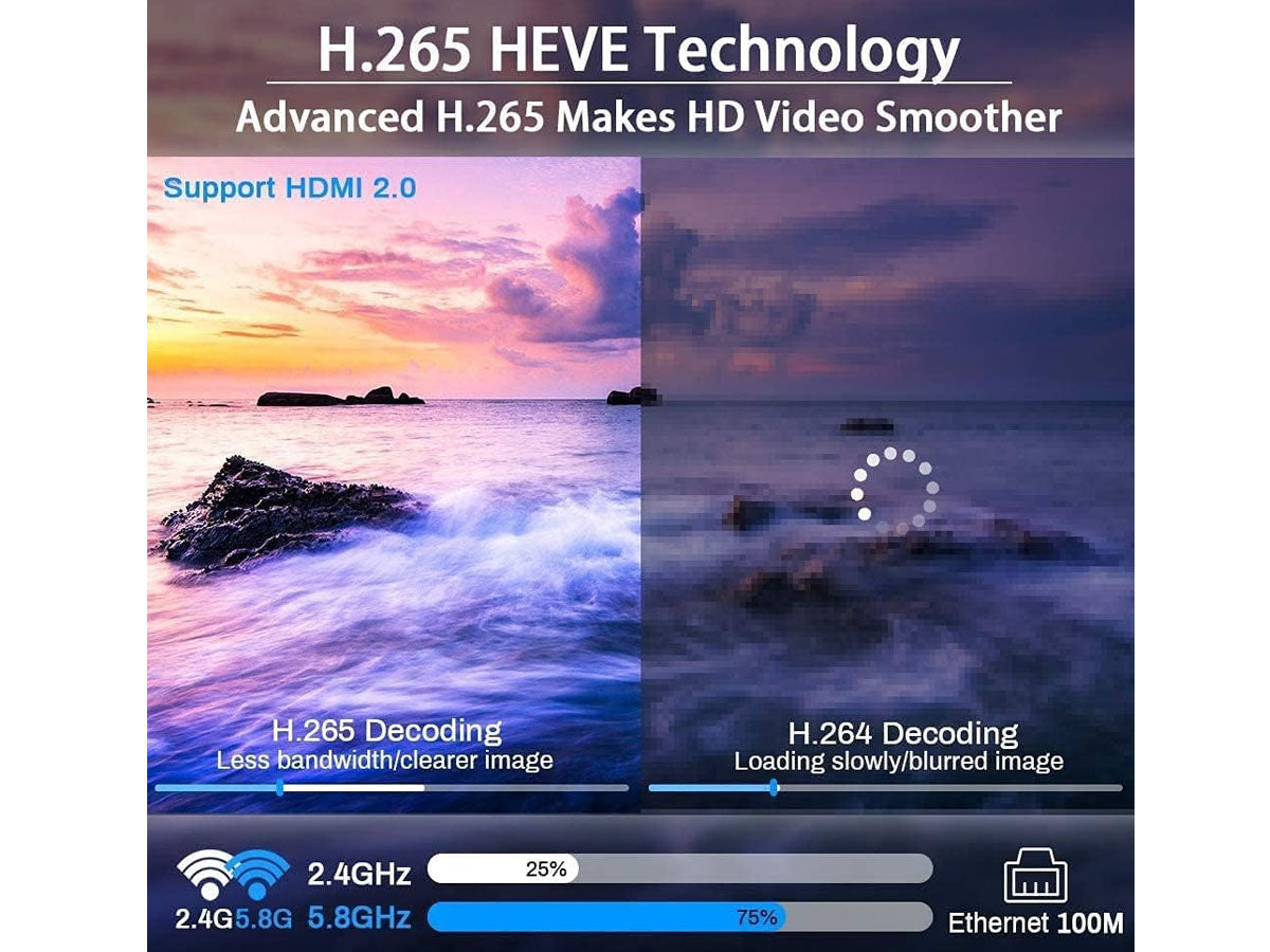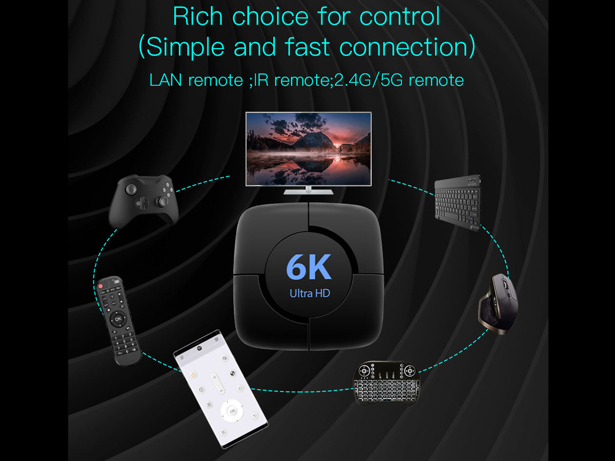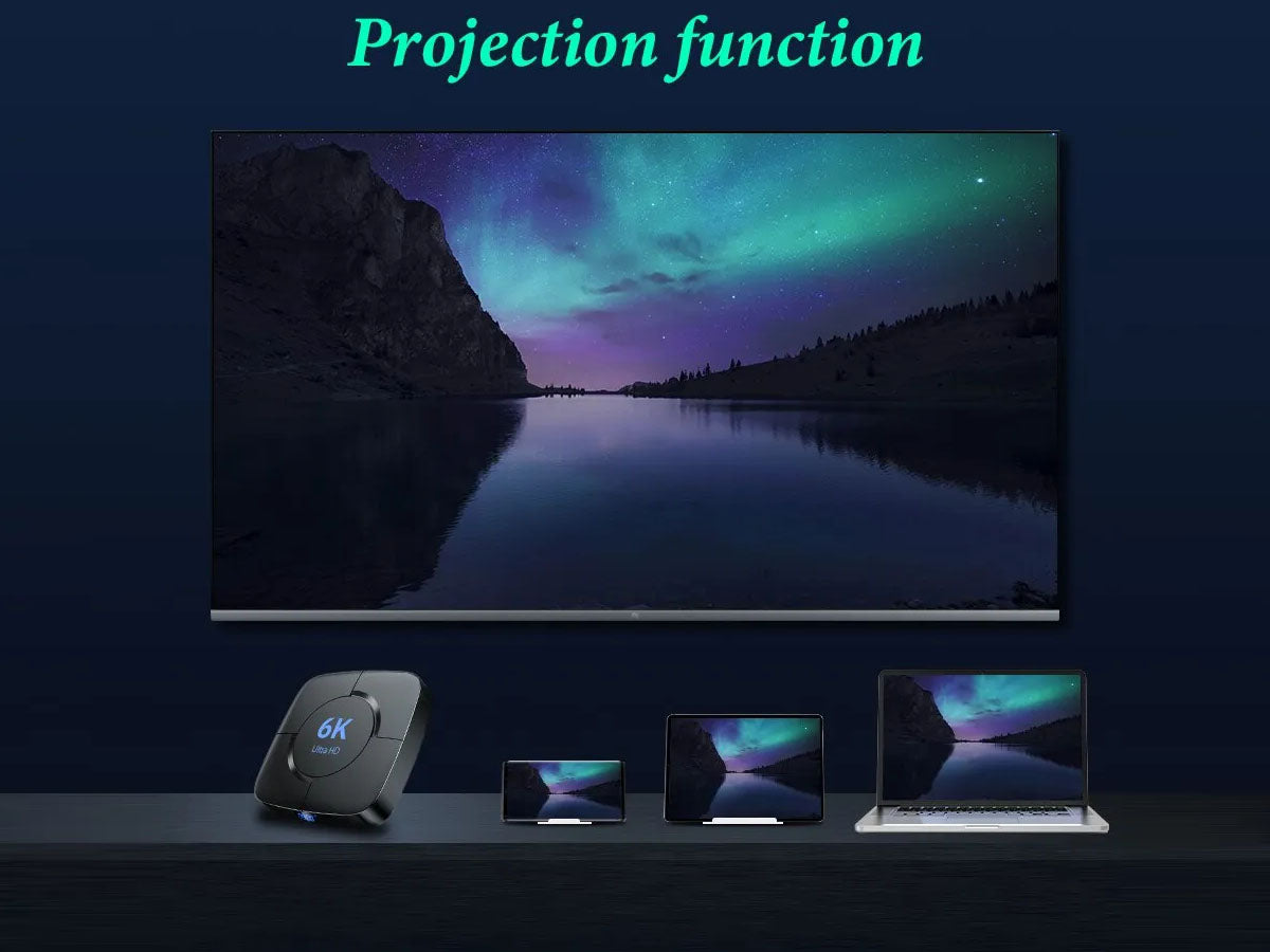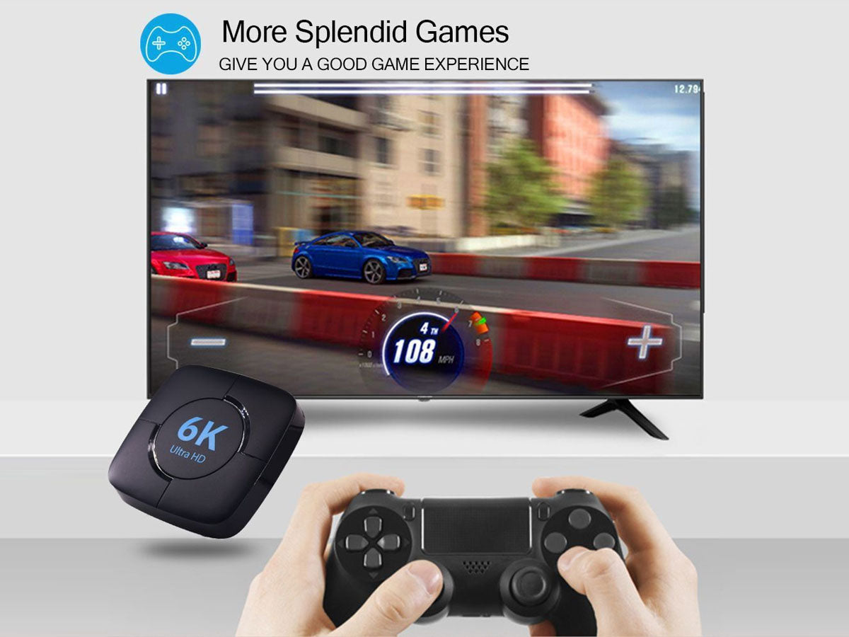 You can expand the storage, play games, and enjoy movies on the big screen. It's also equipped with a voice remote control and supports 2.4G/5G Dual Band WiFi, Bluetooth v5.3, DLNA, Miracast, and Airplay.