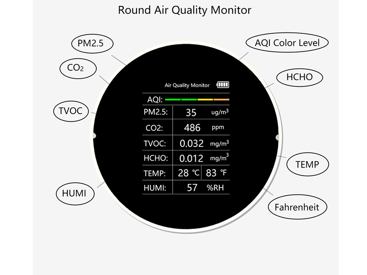 - 7in1 Air Quality Tester to simultaneously detect PM2.5, CO2, TVOC, HCHO, AQI, and humidity.