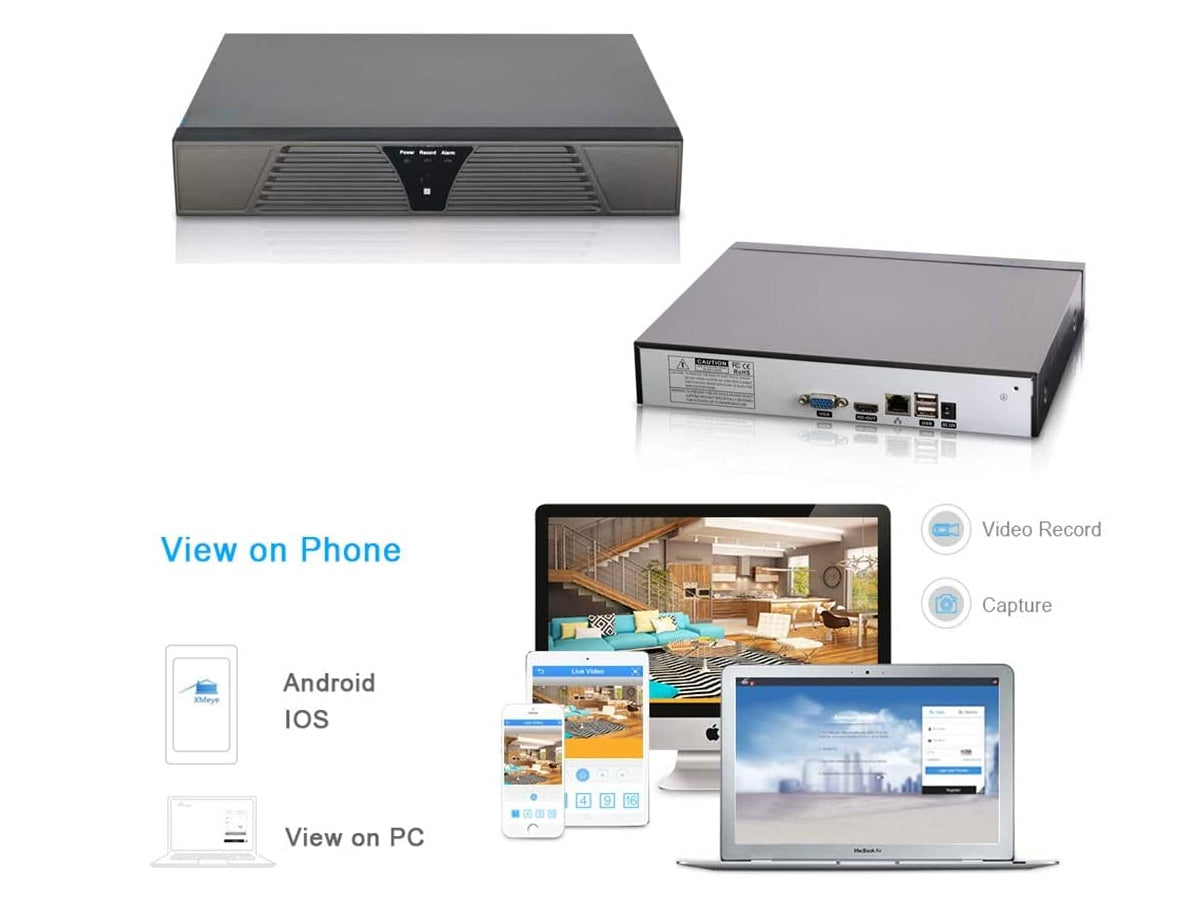 This NVR Security Camera System 8 Ch also provides Cloud P2P function for remote view on smartphones, tablets ( both Android and IOS), and PC.