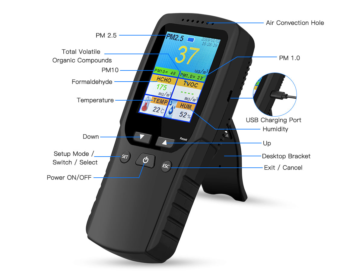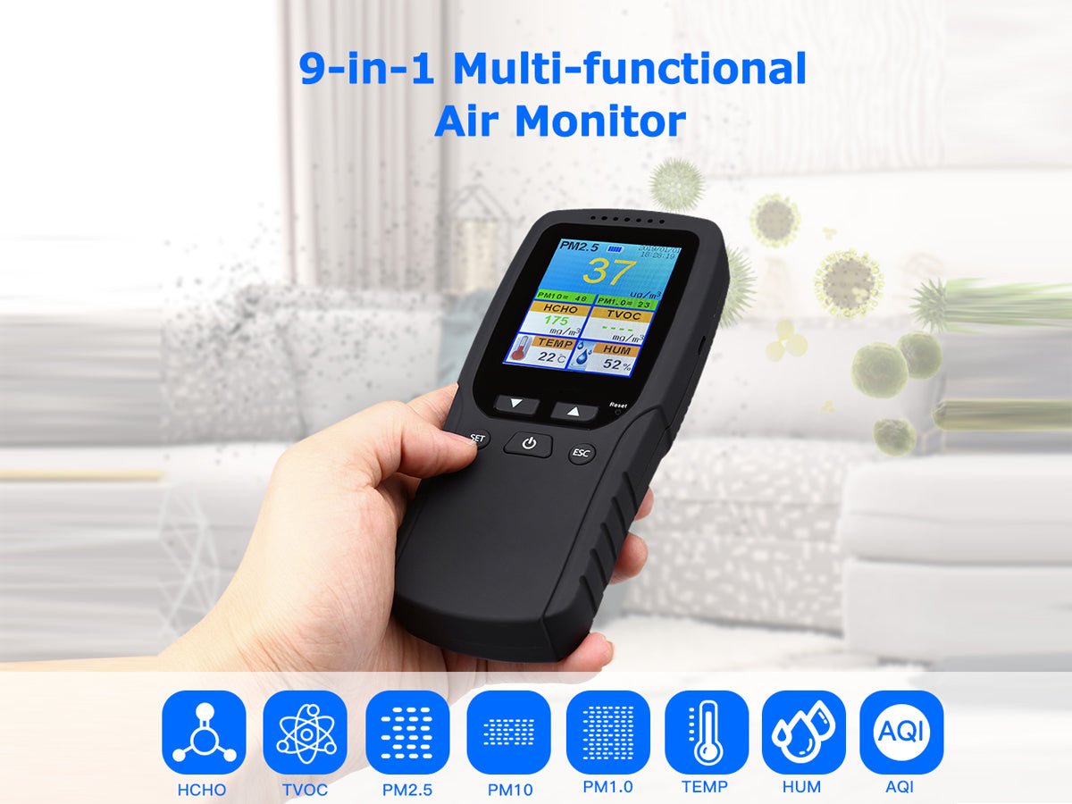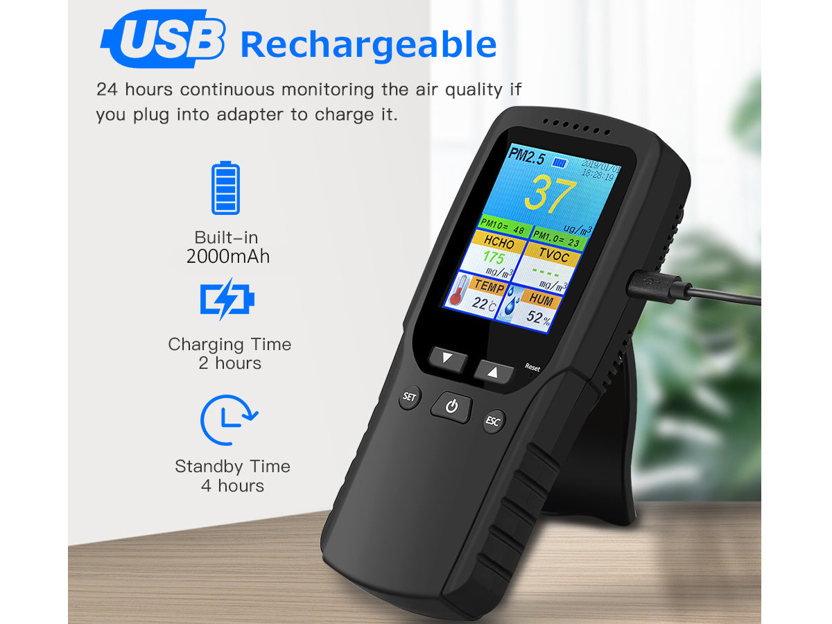 This 9 in 1 Multifunctional Air Quality Monitor with built-in electrochemical sensors will provide you with trustworthy measurements such as formaldehyde concentration (HCHO), PM2.5, PM1.0, PM10, HCHO, TVOC, temperature, humidity, AQI, date/time. It also allows portable testing with a built-in stand that allows Air Quality Monitor to be placed unattended anywhere. The smart air quality monitor has a 2000mAh rechargeable lithium battery that can last up to 8 hours.
