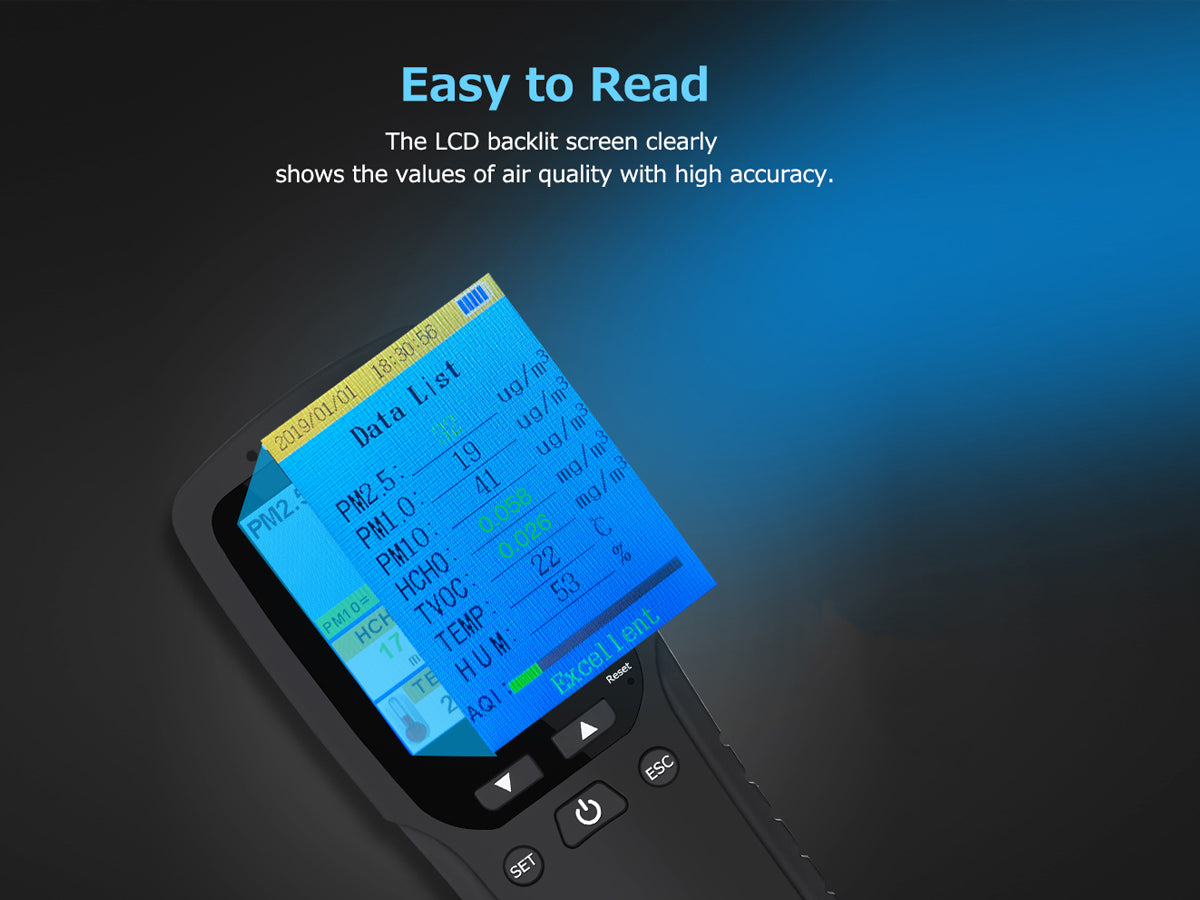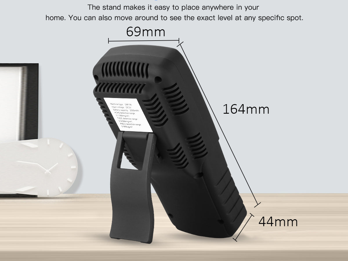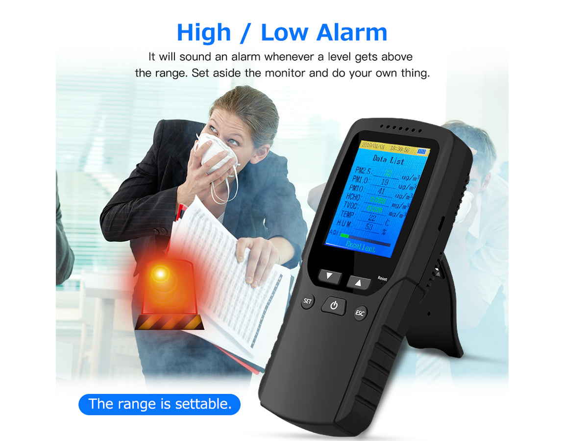 This 9 in 1 Multifunctional Air Quality Monitor with built-in electrochemical sensors will provide you with trustworthy measurements such as formaldehyde concentration (HCHO), PM2.5, PM1.0, PM10, HCHO, TVOC, temperature, humidity, AQI, date/time. It also allows portable testing with a built-in stand that allows Air Quality Monitor to be placed unattended anywhere. The smart air quality monitor has a 2000mAh rechargeable lithium battery that can last up to 8 hours.