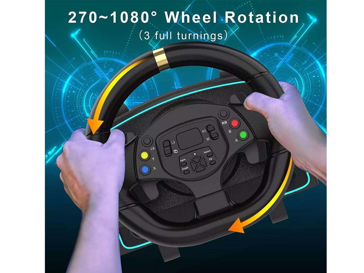 This 9-in-1 Gaming Steering Wheel with LED Lights is perfectly compatible with PC, Xbox ONE, Xbox Series X/S, Xbox 360, PS4, PS3, Nintendo Switch, Android, and X input systems. The 6-speed Manual H/L gear Shifter, Volume Control, Vibrations, and Force feedback simulate a realistic driving experience with precise steering and progressive dynamic pedaling.