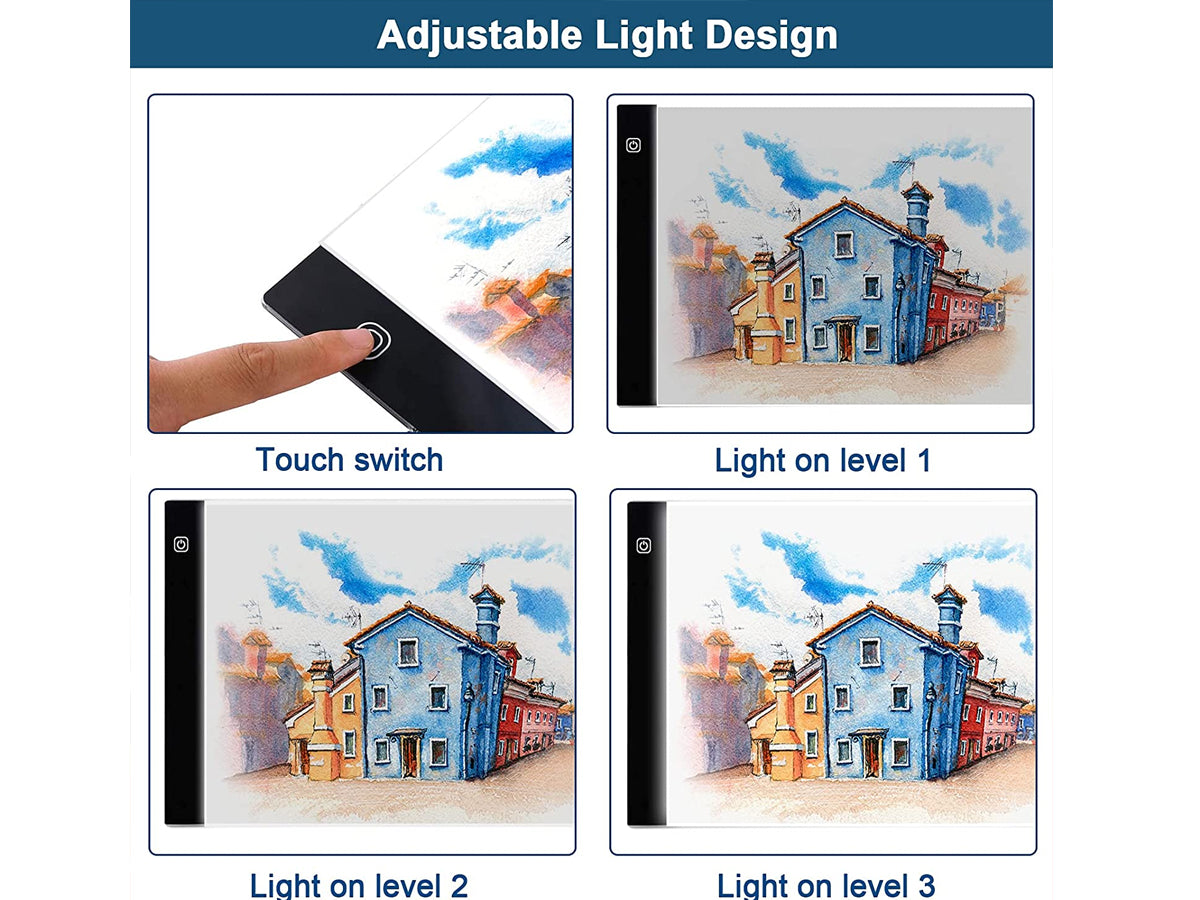 This Lightweight USB Powered A4 LED Light Box with just 0.35cm thickness is easy to carry. You can choose the low-middle-high level to adjust brightness by pressing the button. LED Light Box with touch sensor switch design, turn on/off, and brightness control easily by touching one time to choose the level. This ultra-thin USB-powered A4 LED Light Box adopts vision protection technology, which allows you to have a clearer and brighter vision in work, such as sketching, tattoo drawing, diamond painting, viewing, and so on. Plug and play, easy to use, help you save more creative time.