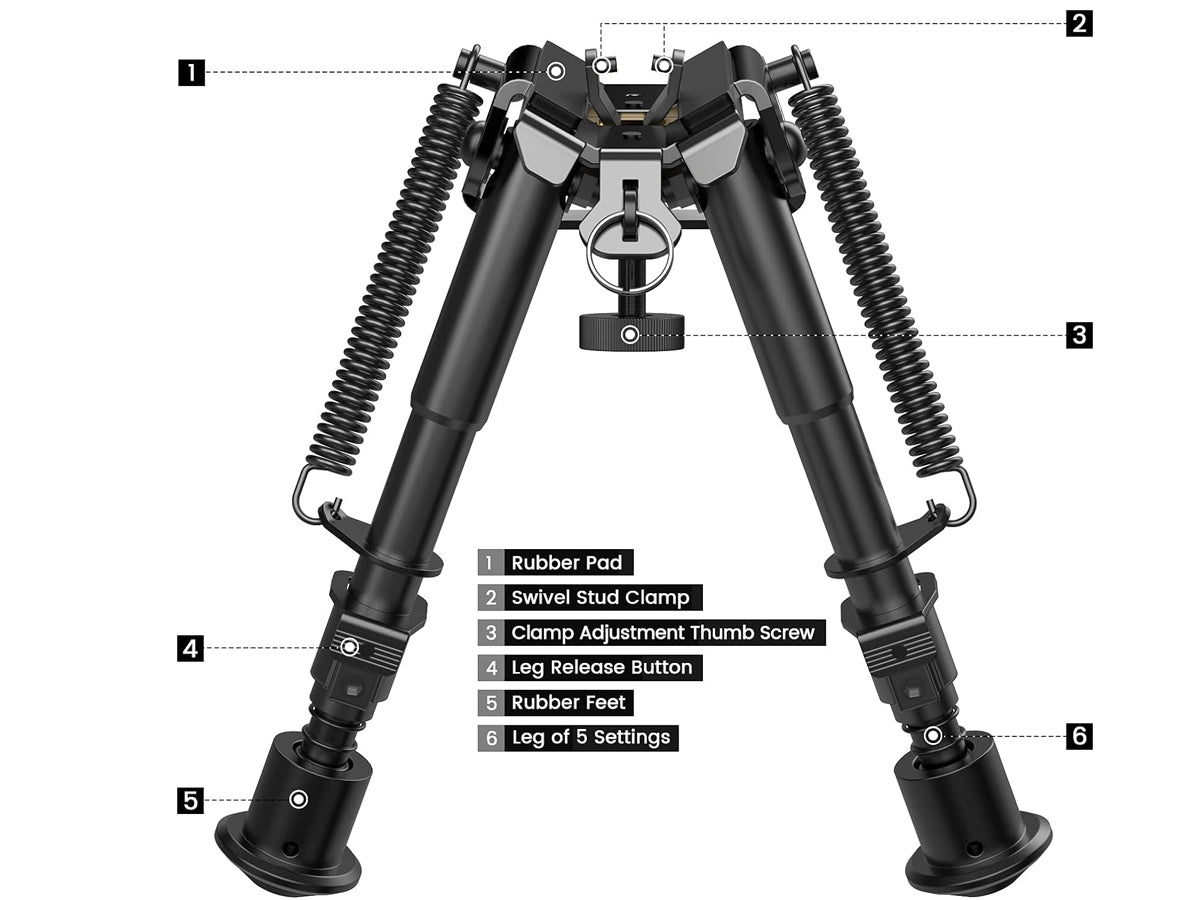 - Rubberized bipod legs provide stability and prevent slippage during use