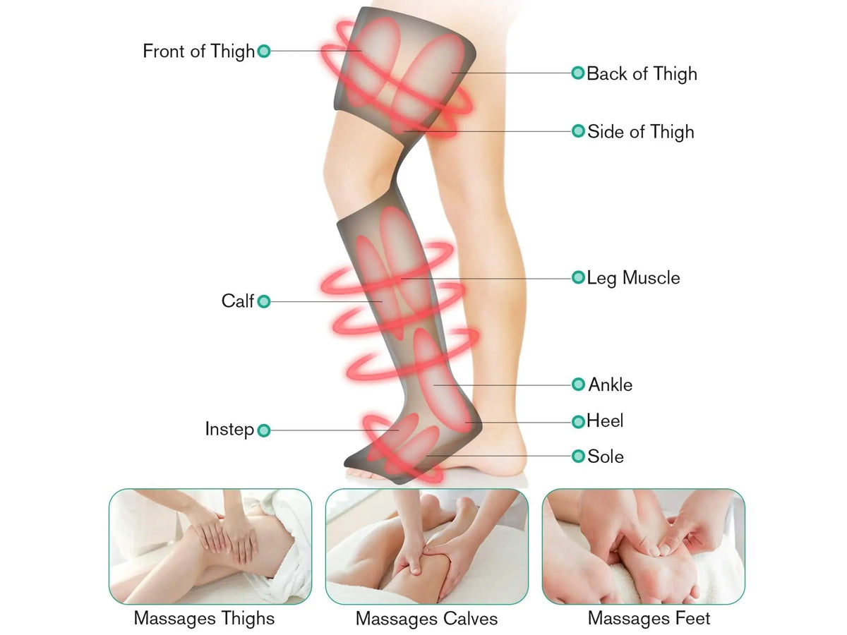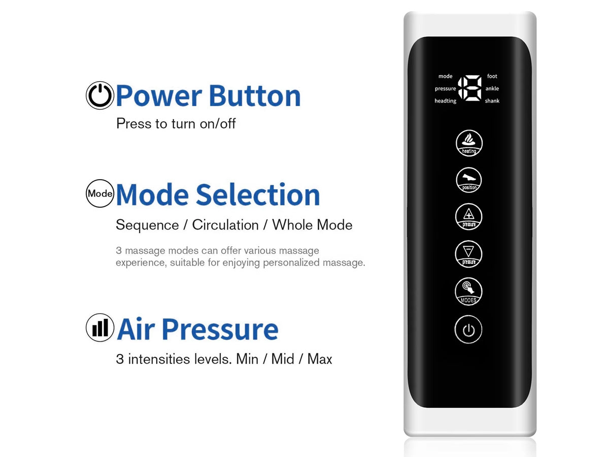 - Air Compression leg massager with three massage modes: sequence, circulation, and whole mode