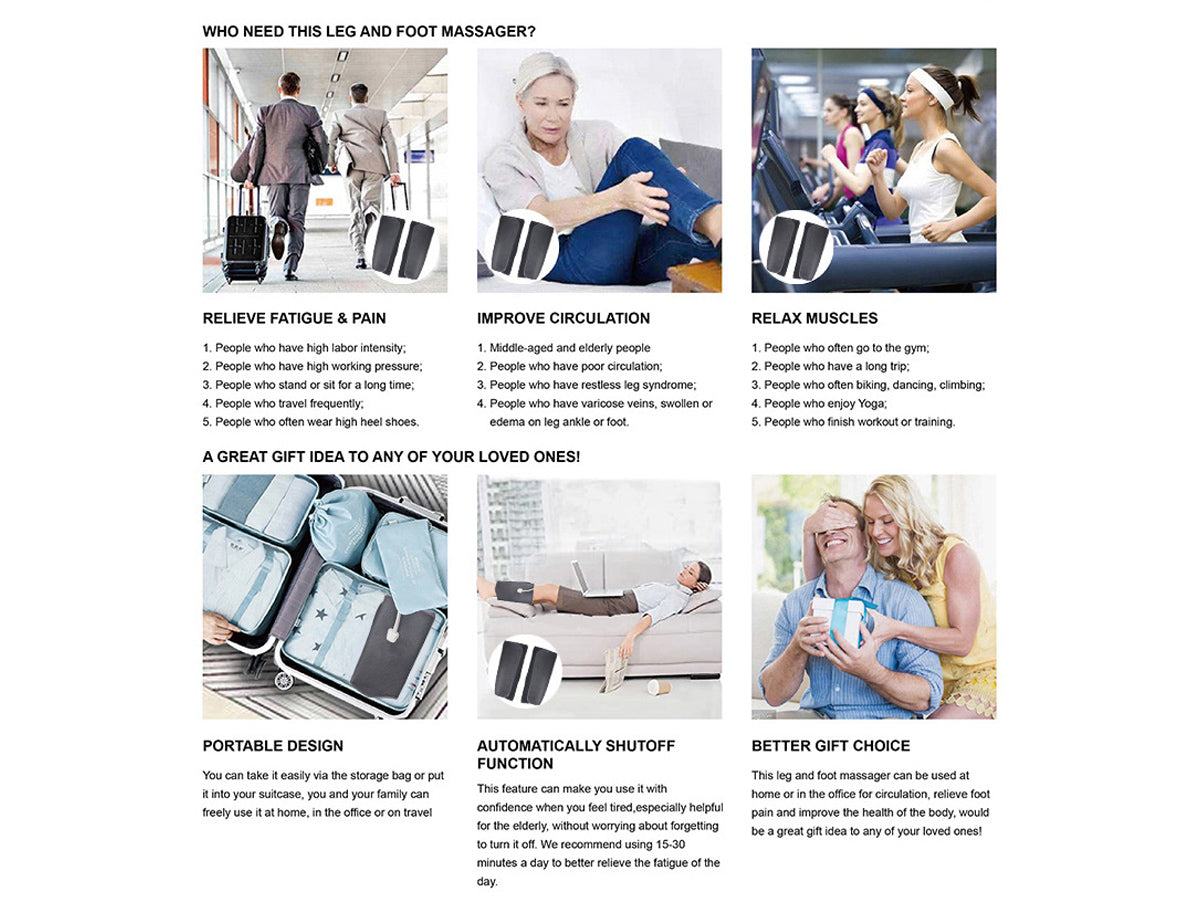 This Leg Massager is Ideal for relieving leg and calf discomfort, promoting blood circulation, and enhancing relaxation. Suitable for use at home, in the office, or while traveling.
