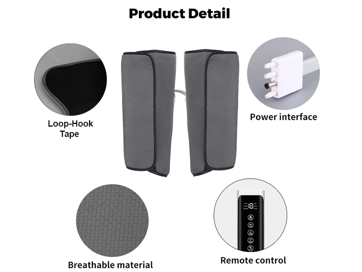 Elevate your relaxation experience with our Leg Massager New. Featuring three massage modes and adjustable intensity levels, this Leg Massager New provides versatile relief tailored to your needs. Enjoy the convenience of LED remote control and Breathable material for ultimate comfort. With 13 airbags targeting various leg areas, it offers a comprehensive wrap-around experience. Compact and portable, it's perfect for use at home, in the office, or while traveling