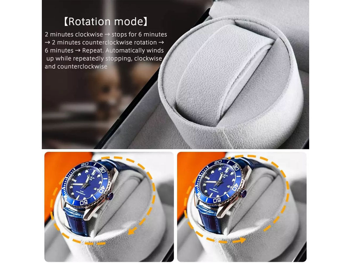 The Luxury Automatic Single Watch Winder is programmed to avoid continuous turns. It operates clockwise and counterclockwise as well as bi-directional and pauses intermittently.