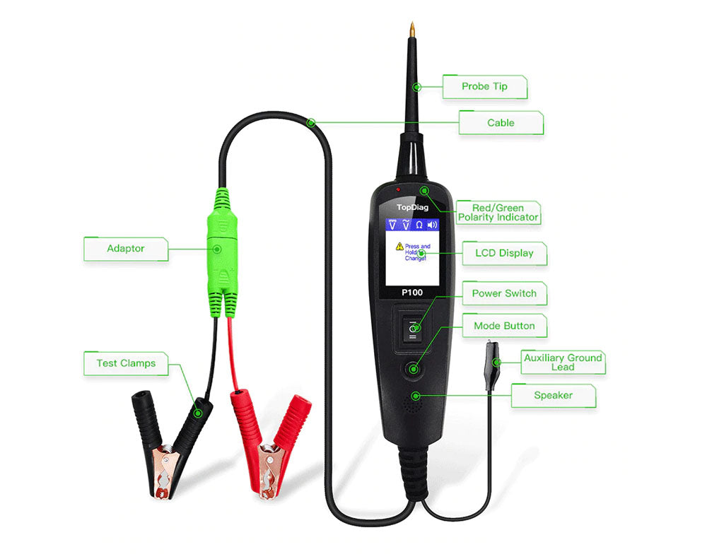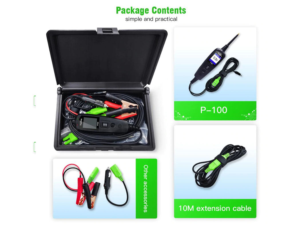 This Power Probe Car Electric Circuit Tester can test car battery voltage, AC and DC voltage, resistance, leakage, short-circuit, components activation Overload protection, etc. Power Probe Car electric Circuit Tester with a large battery clip can carry more load. This Power Probe Car Electric Circuit Tester supports a wide input voltage range, also supports 12V cars and 24V trucks.