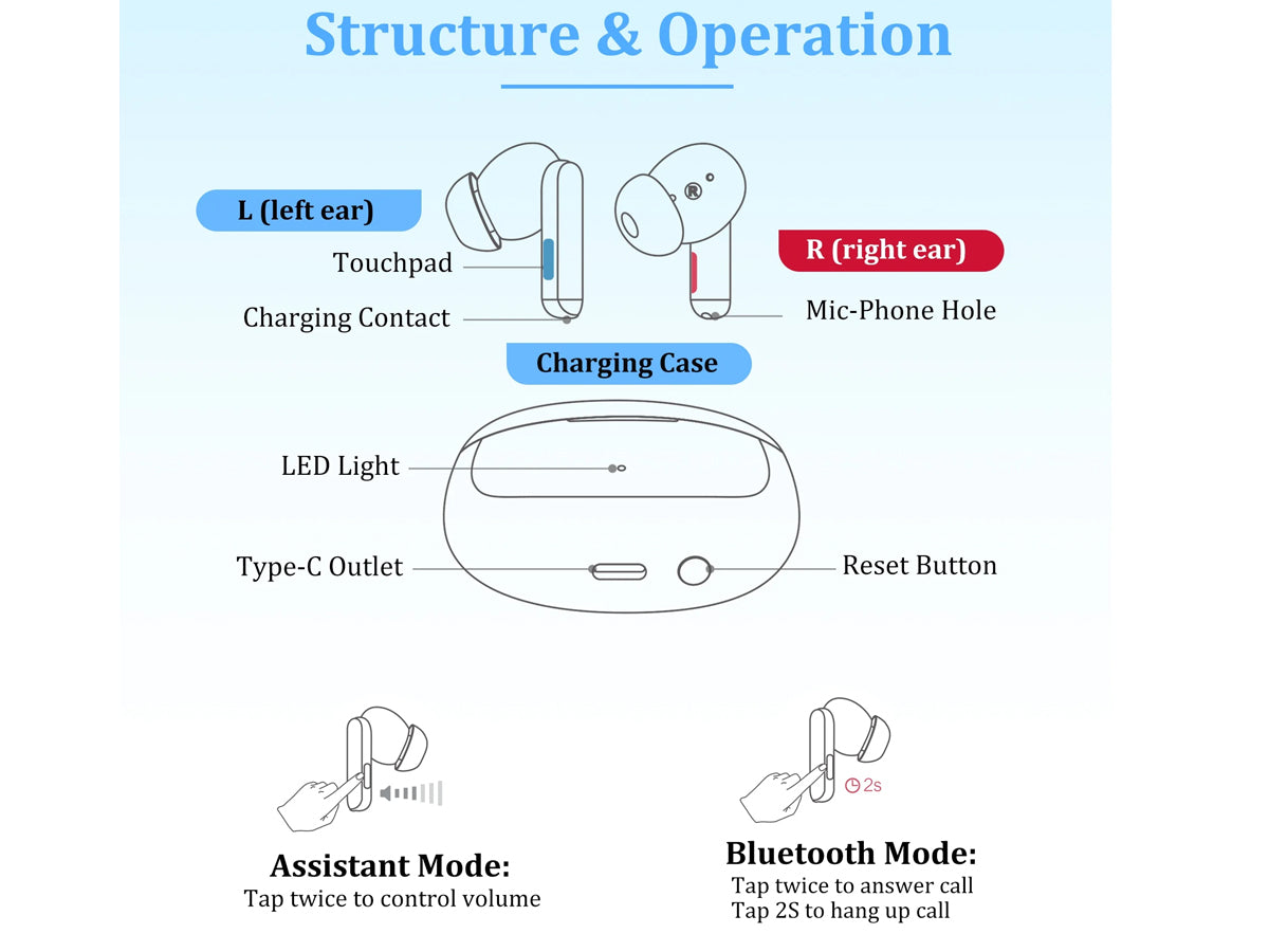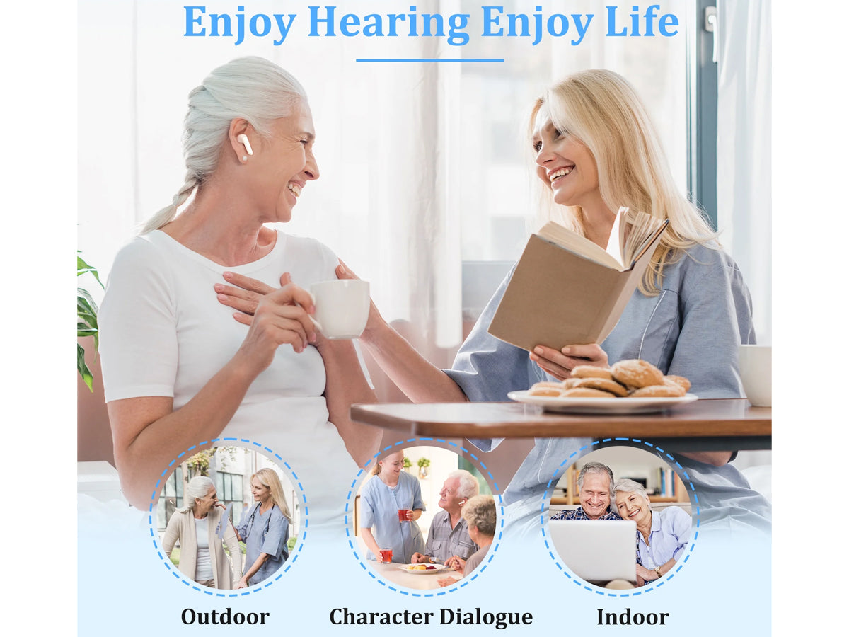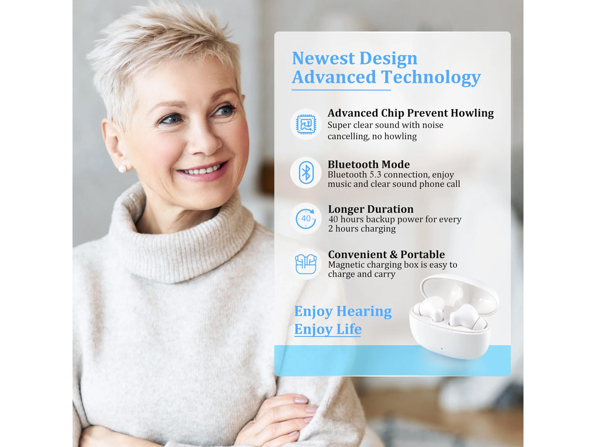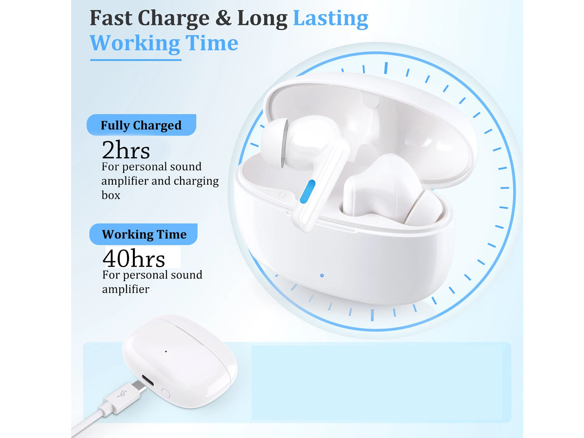 Enjoy clearer sound with these Wireless Rechargeable Bluetooth Hearing Aids. Hearing Aids featuring noise cancellation, Bluetooth 5.3, and touch controls, they offer great performance for music and voice. The 750mAh charging box provides 40+ hours of use, while multiple modes and soft silicone eardomes ensure comfort and easy adjustment in any environment.