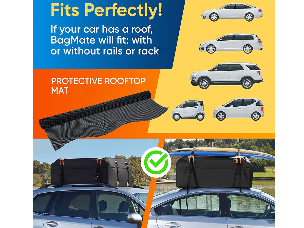 This Cargo roof pocket fits all cars and SUVs. It comes with a total of 8 straps and every strap has two buckles to adjust the length of the belt. This Roof Bag can be used with or Without Rack. The roof bag can be installed in a few minutes; the straps can be installed in different combinations, depending on the cargo and roof carrier type. It Comes With Non-Slip Mat Which protects the Roof from Friction Marks During Travel. The matt can be used for multiple purposes.
