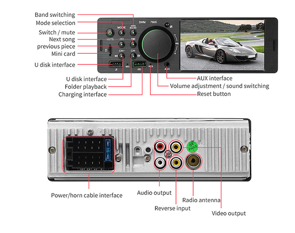 - If connect to a car backup camera, when the car is in the reverse gear, the car stereo monitor will turn to rear view reversing details automatically