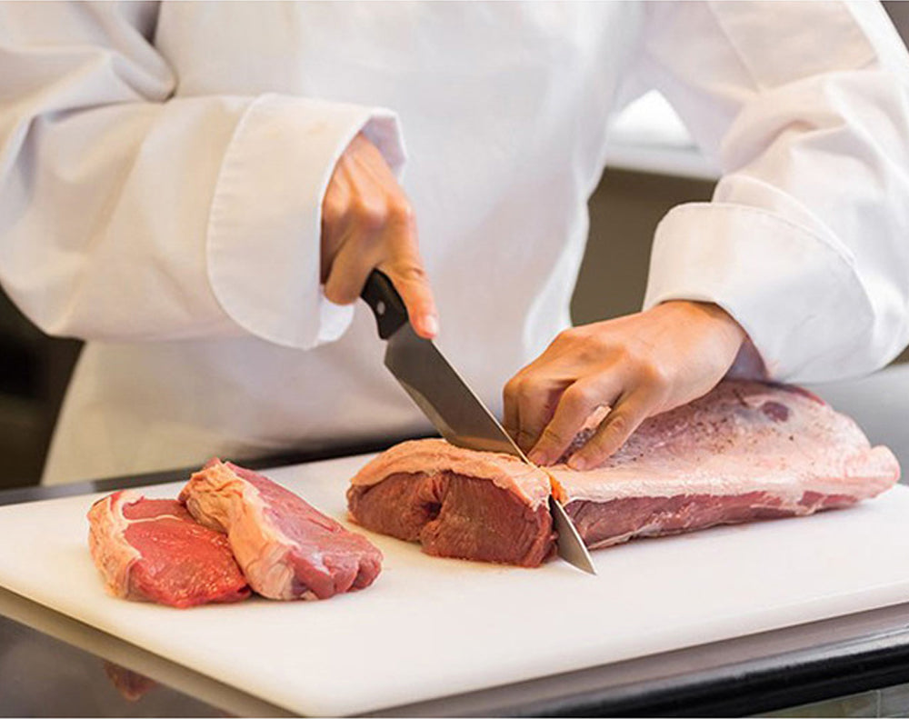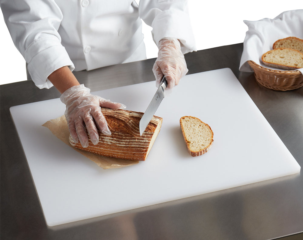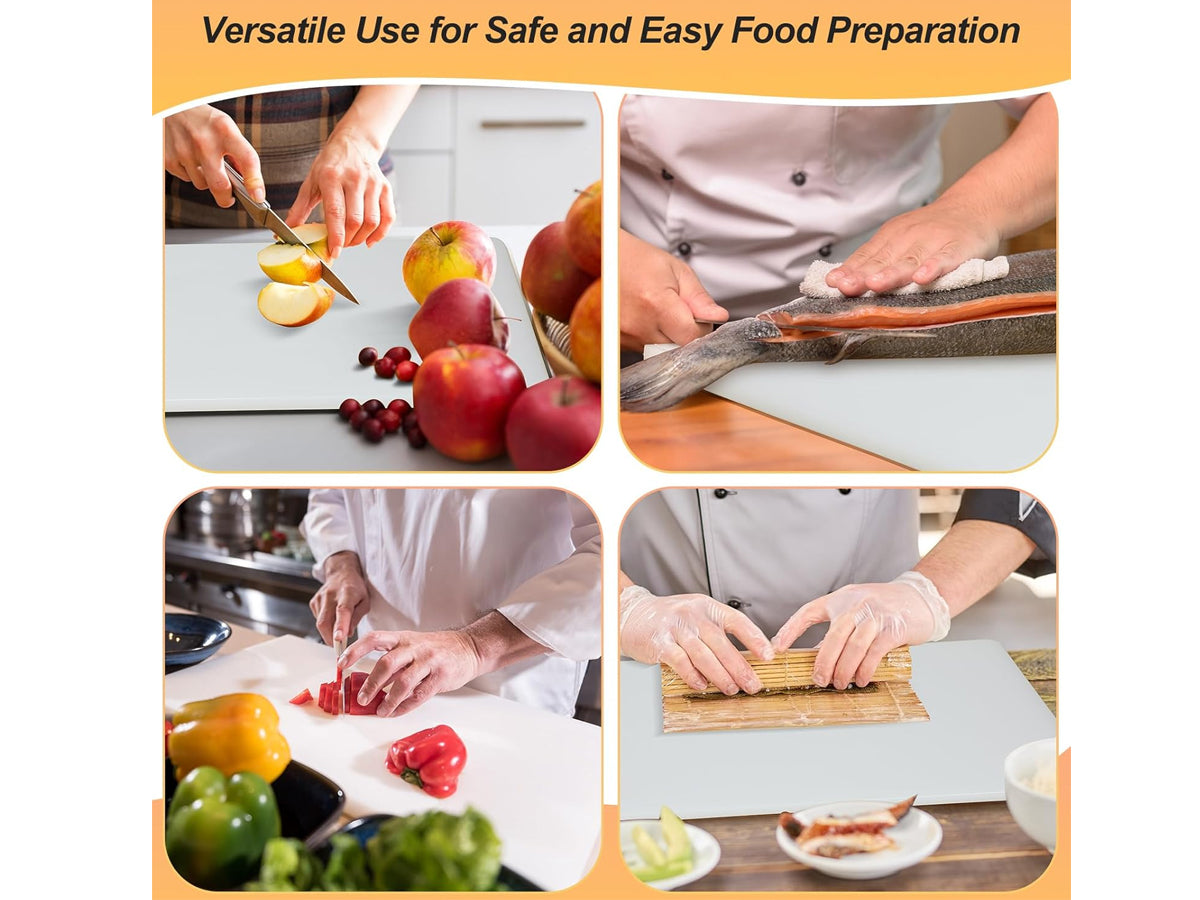 Can be used for vegetables, fruits, raw meat, fish, poultry, cooked, meats, bakery, and diary products along with being allergen safe. Cutting board also has a non-skid surface to improve your safety when using this item.
