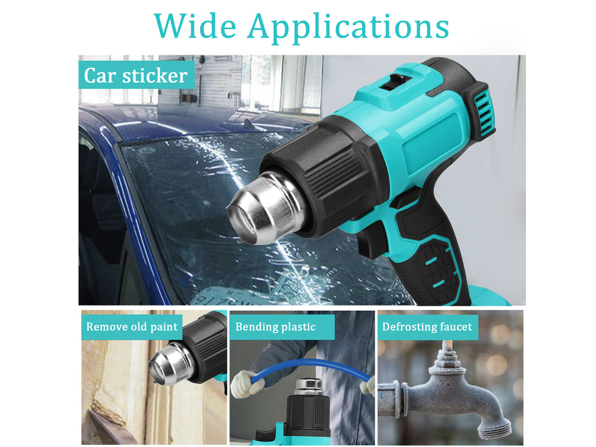 Versatile applications include shrink wrapping, pipe defrosting, and loosening nuts. Perfect for car film, softening wires, shrinking plastics film, installing electronic components, dissolving pipes, removing old paint, and de-icing functions.