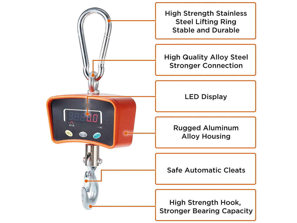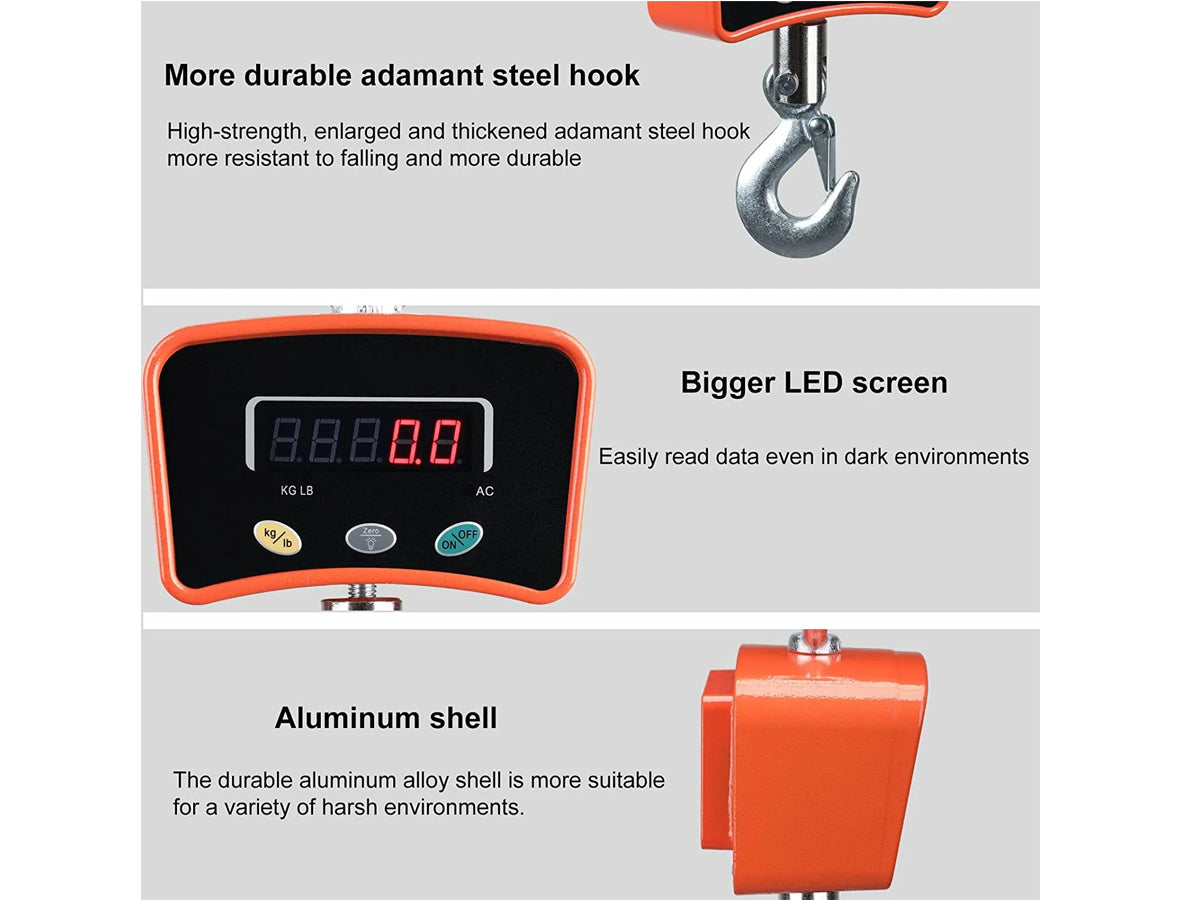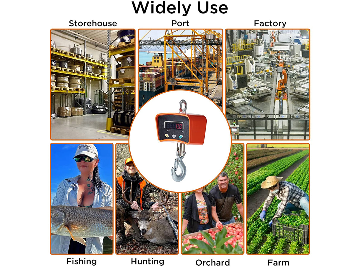 The Crane Scales 1000KG is ideal for a variety of scenarios such as factories, warehouses, farms, construction sites, and more. It's perfect for weighing heavy items such as luggage, cargo, livestock, and equipment.