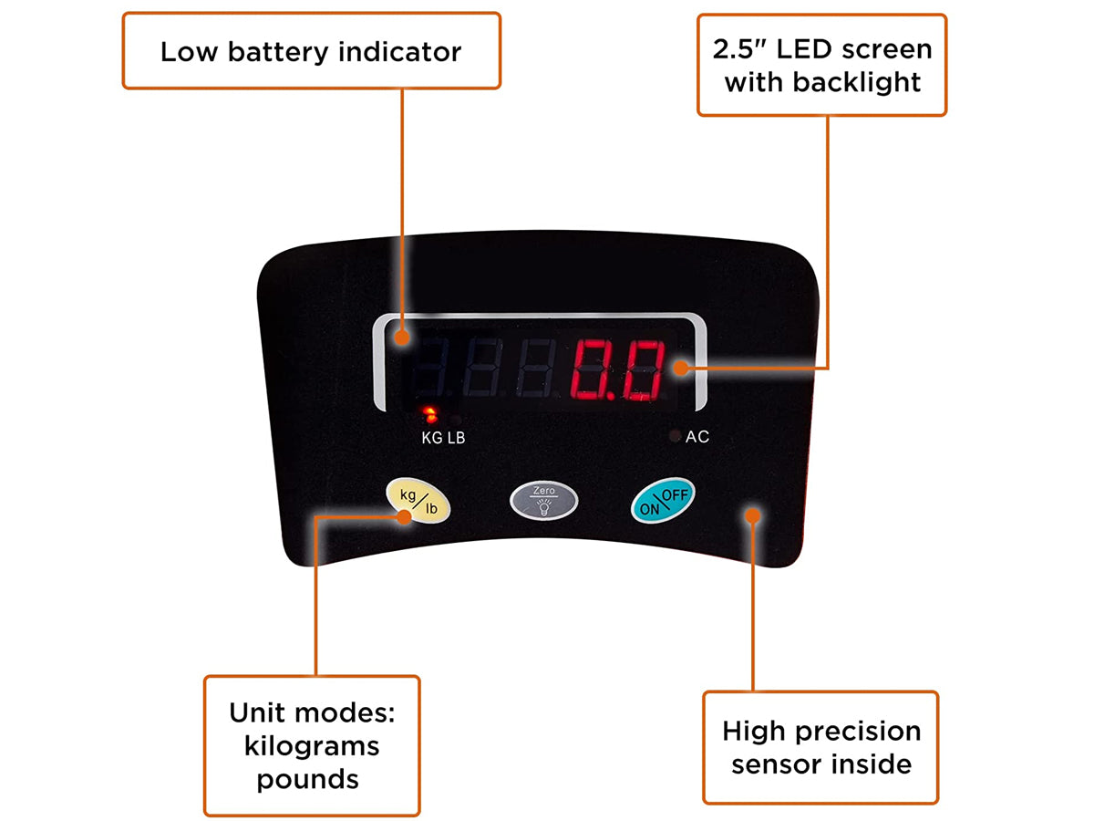 - Switch between kilograms and pounds for easy weighing