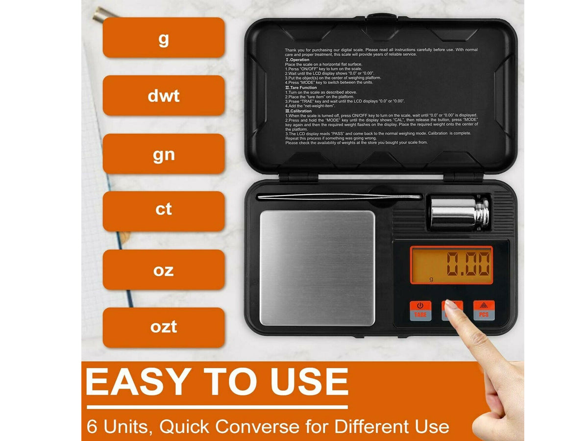 - Weighs Jewellery and Kitchen items up to 200g with precision