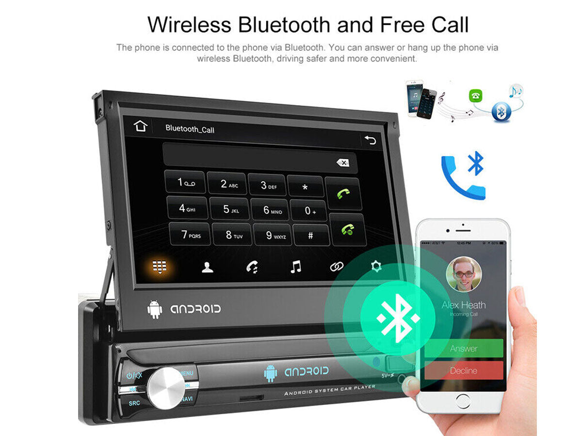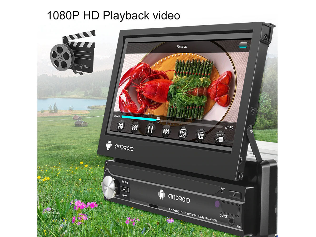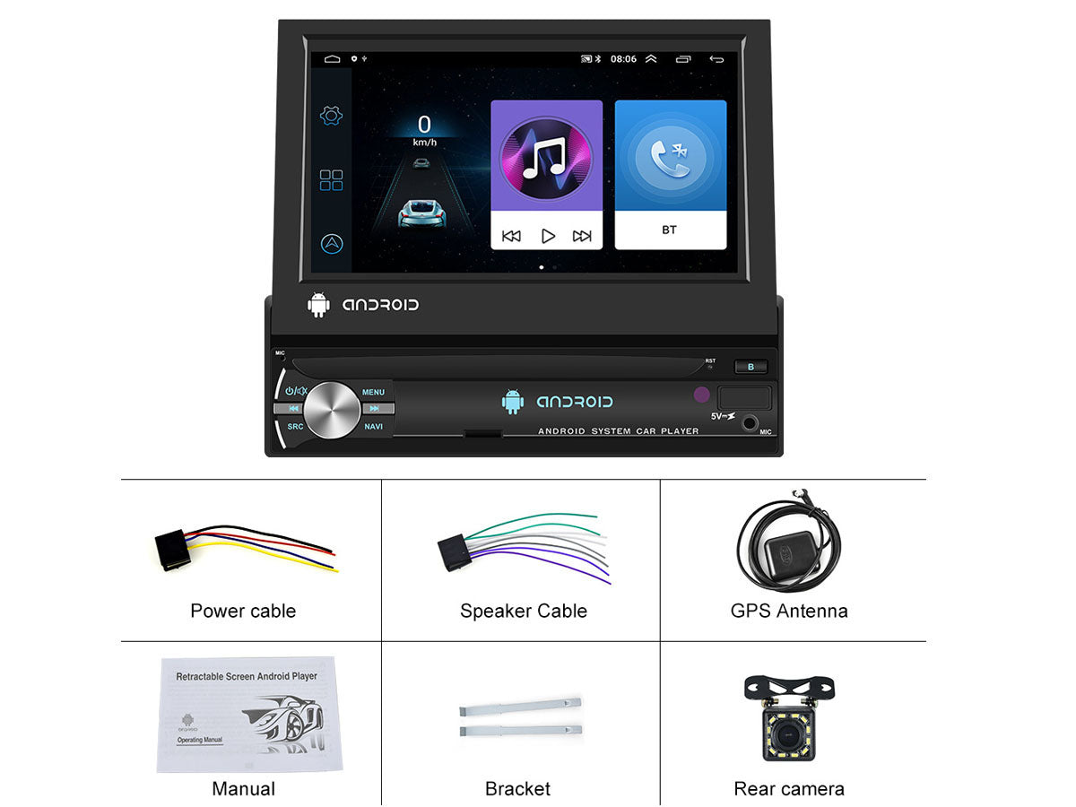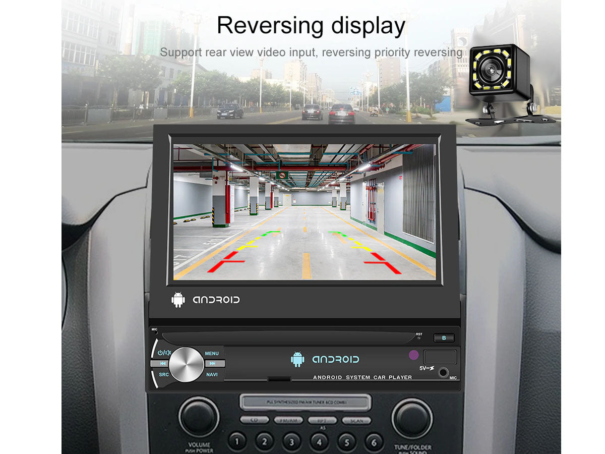 Enjoy its amazing features with our 7" WiFi Android MP5 Car player such as the 1080P high-definition touchscreen, GPS navigation, and built-in Bluetooth with hands-free calling. The retractable screen is perfect for saving space while the 160° Wide View Rear Camera Angle keeps you safe on the road.