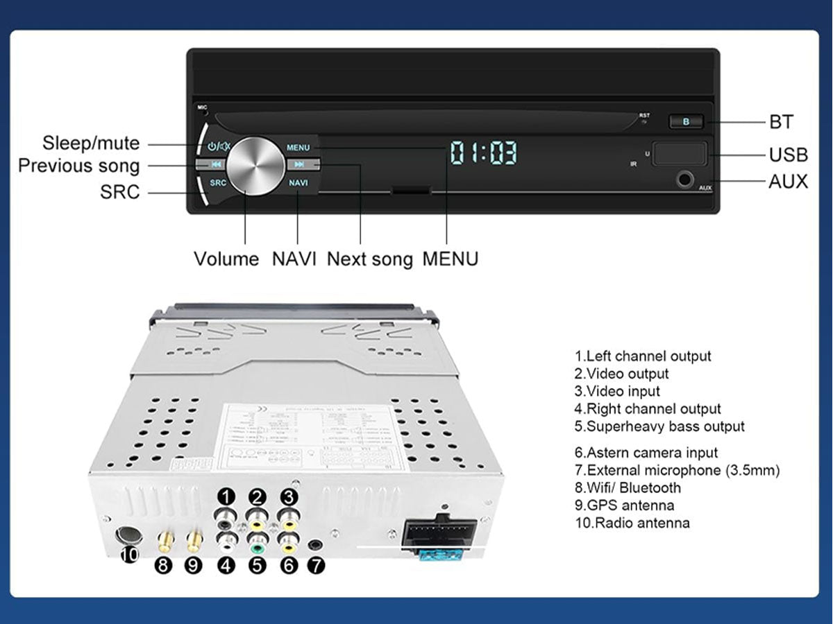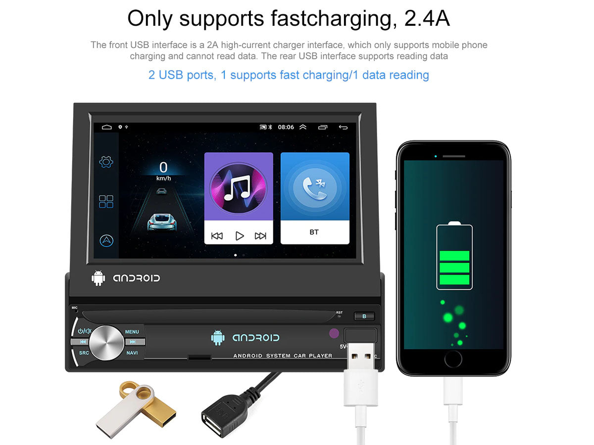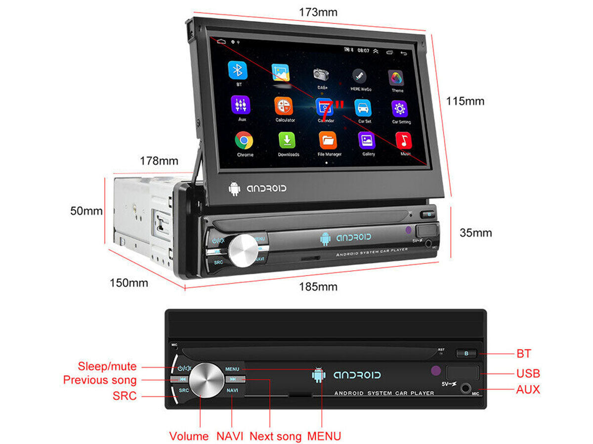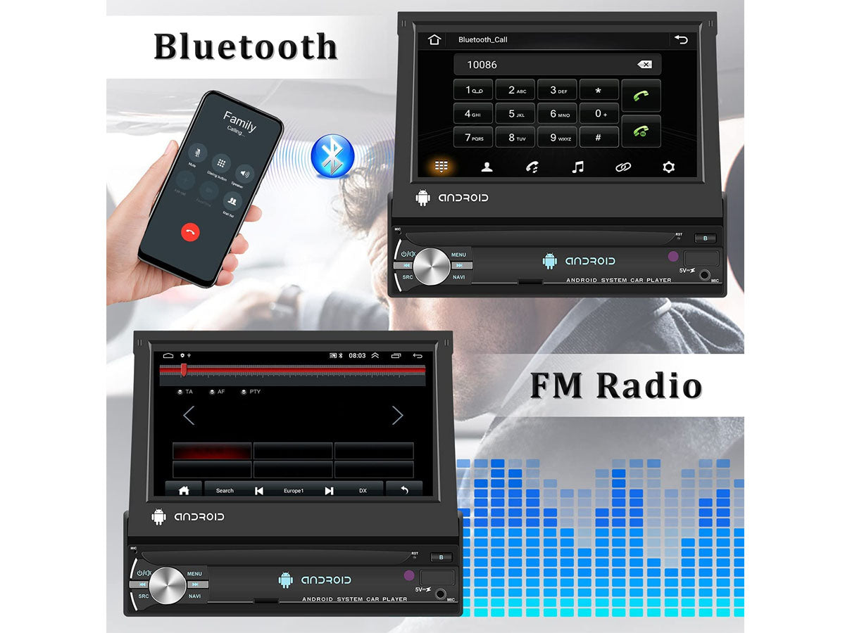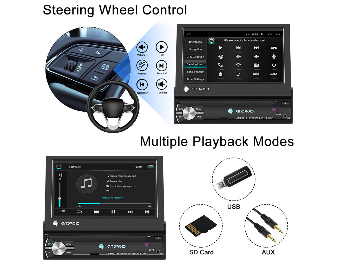 Enjoy its amazing features with our 7" WiFi Android MP5 Car player such as the 1080P high-definition touchscreen, GPS navigation, and built-in Bluetooth with hands-free calling. The retractable screen is perfect for saving space while the 160° Wide View Rear Camera Angle keeps you safe on the road.