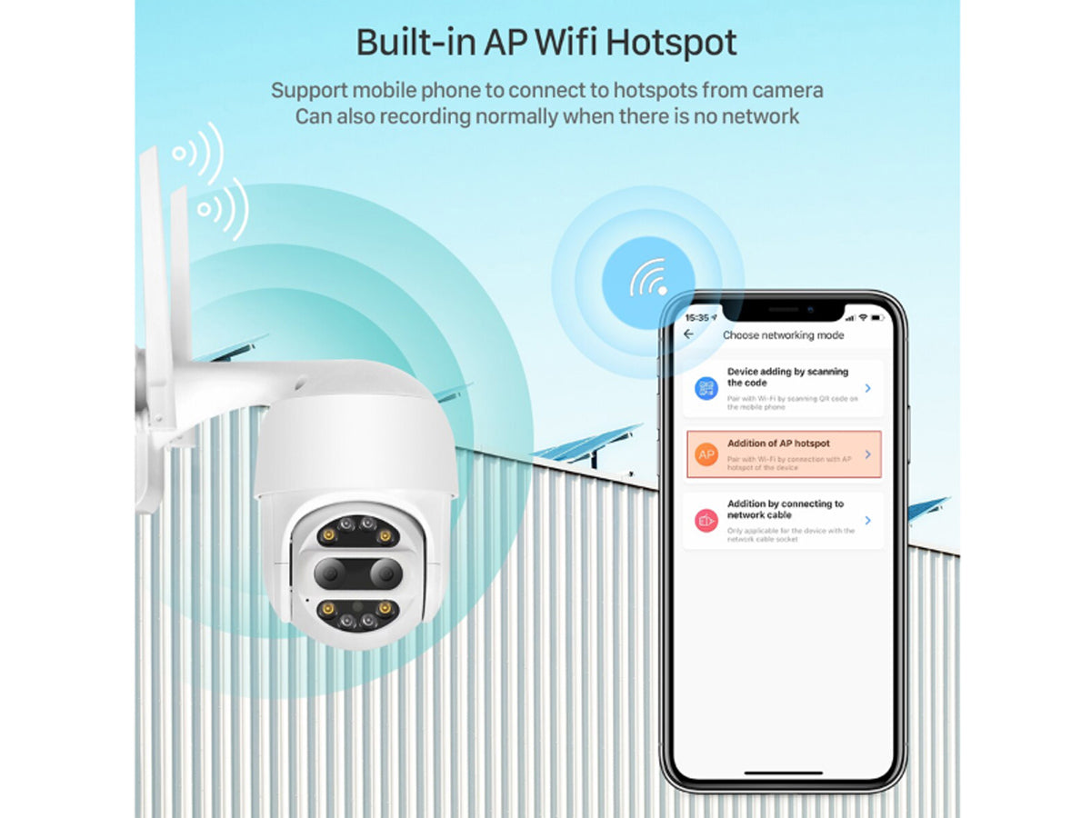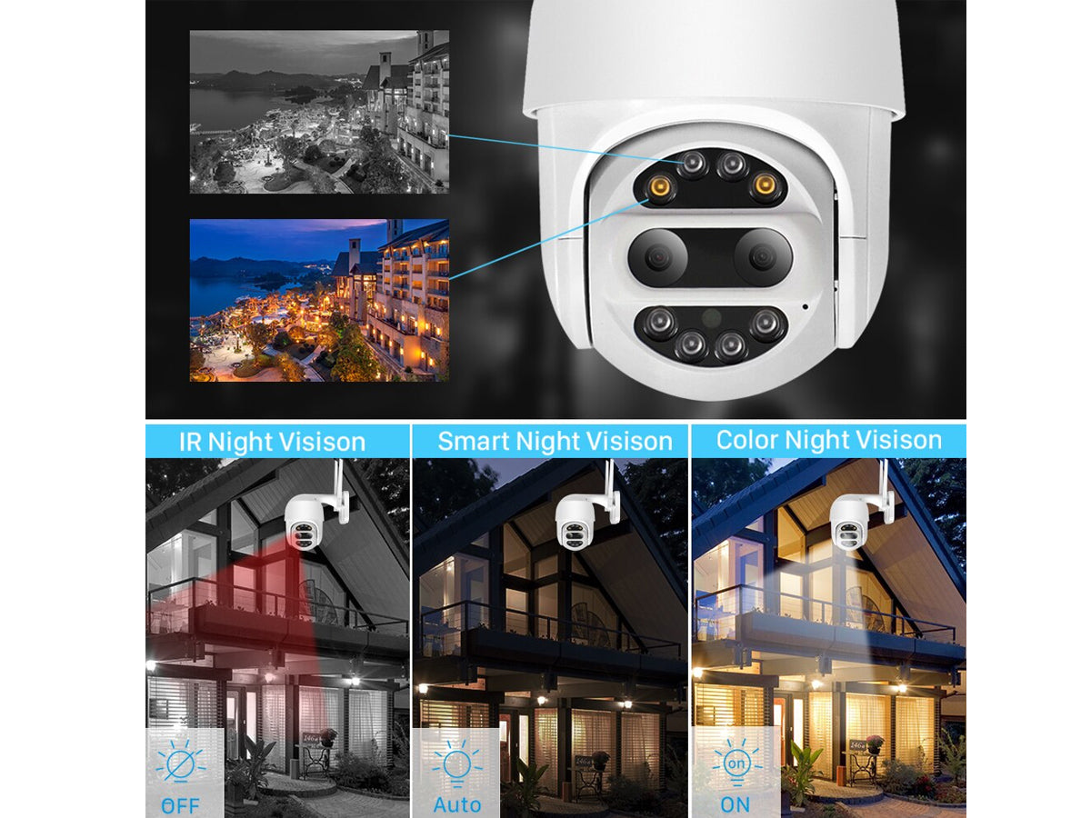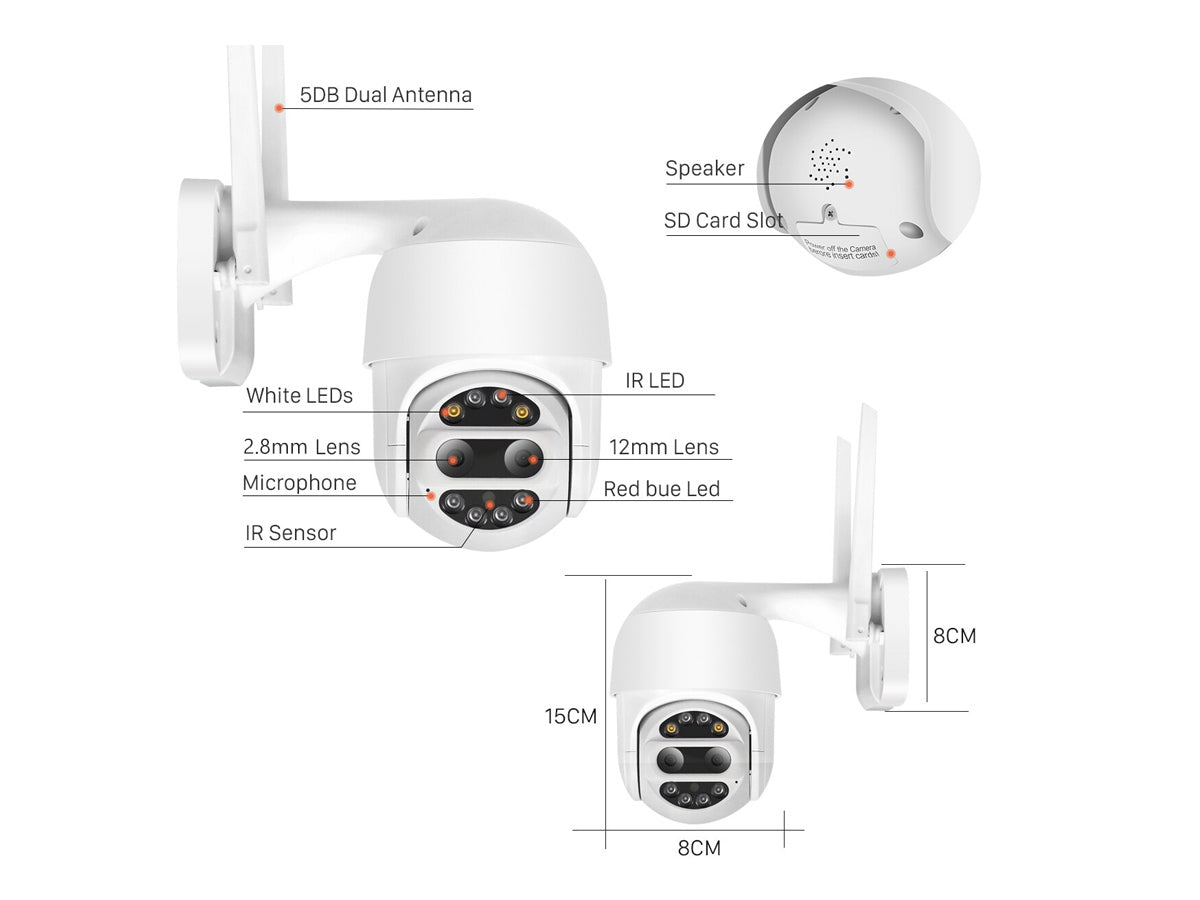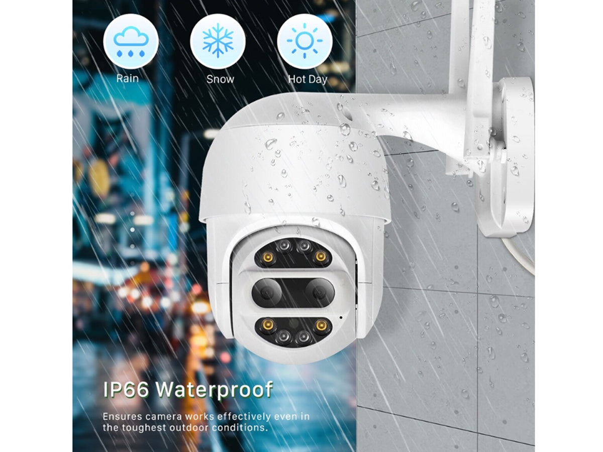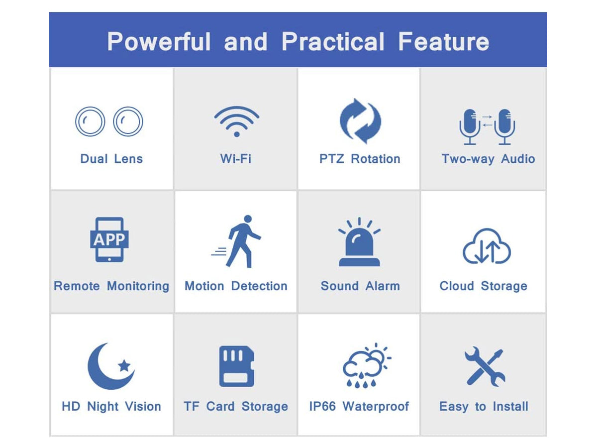 This Home Security Camera has multiple features like Dual Cameras, 2K high-resolution cameras with wide angles, a Motions sensor with push notification, Night Vision, Two-way voice, multiuser management and WiFi, ONVIF, Waterproof etc. This Home Security Camera support zooms up to 8X, catching farther and clearer details that matter. The Home Security Camera is IP66 Waterproof.
