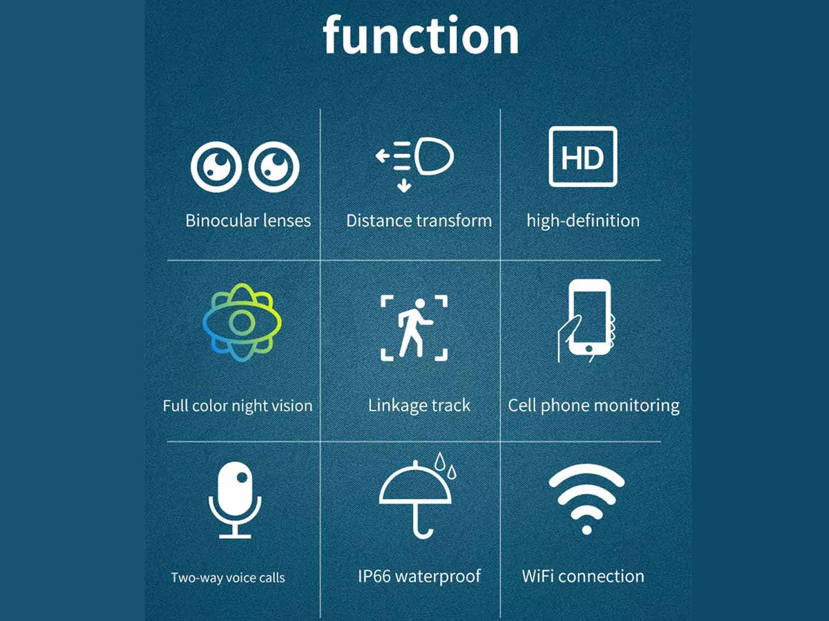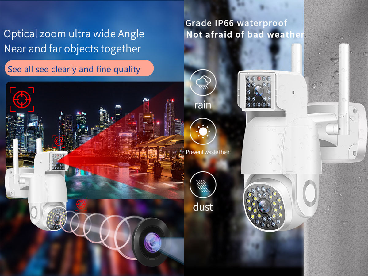 This Dual Wireless Security Camera support zooms up to 8X, catching farther and clearer details. The Wireless Security Camera is IP66 Waterproof.