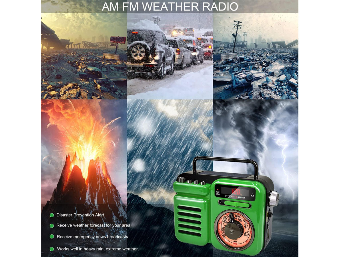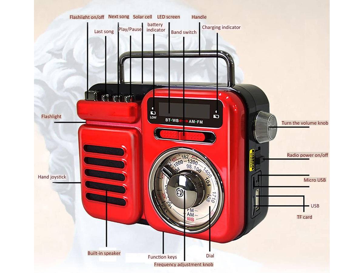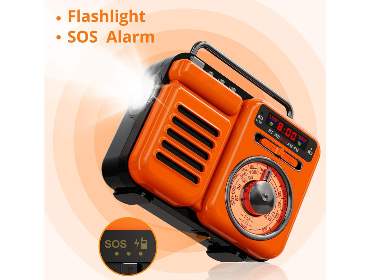 Experience ultimate versatility with our Portable FM Radio. This multifunctional device combines a Bluetooth speaker, AM/FM/NOAA radio, LED flashlight, digital alarm clock, a sleek retro-style look, and a powerful 2000mAh rechargeable battery.